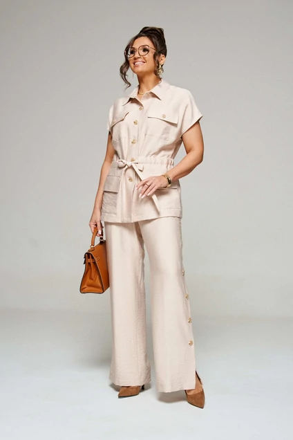 Стильный костюм состоит из жакета-рубашки и брюк, выполнен из мягкой ткани с волокнами льна и вискозы, практичен в носке.