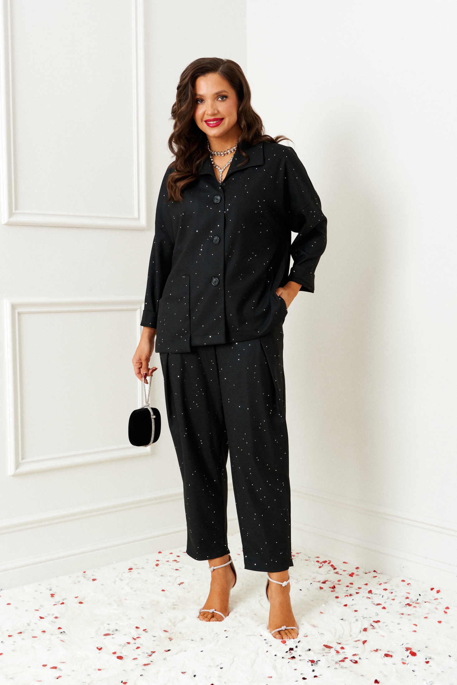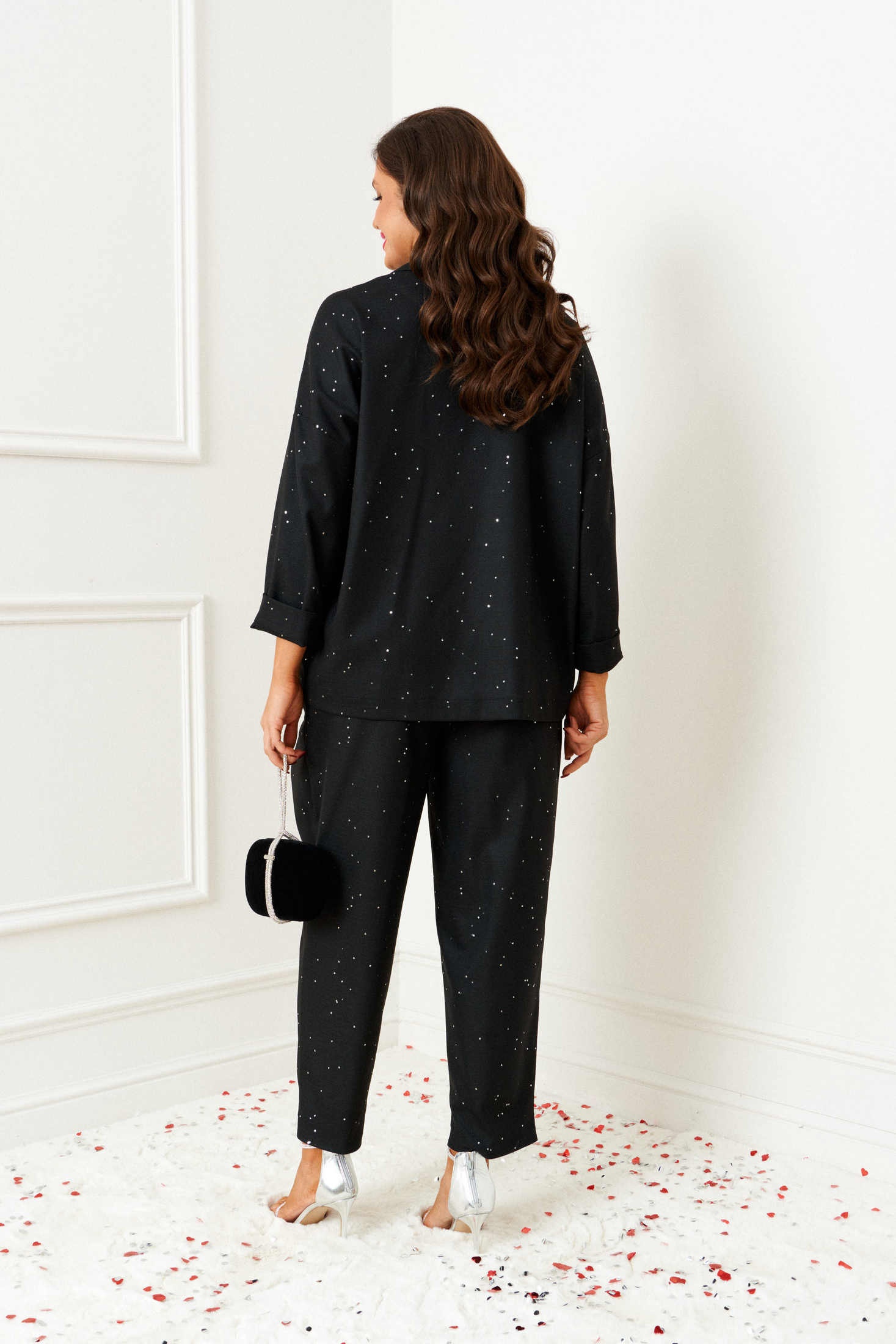 Брюки прямого силуэта свободные вверху и слегка зауженные к низу, длиной до щиколотки, с двумя верхними боковыми карманами и двумя заложенными глубокими складками от пояса спереди.Высота сиденья классическая. Застежка центральная на молнию и на петлю с пуговицей на поясе.Брюки на притачном поясе, в задней части которого для удобного прилегания по талии вставлена резинка. Длина рубашки (по середине спинки) ~ 65 см. Длина рукава рубашки ~ 39,5 см. Длина брюк (с поясом) ~ 96см.