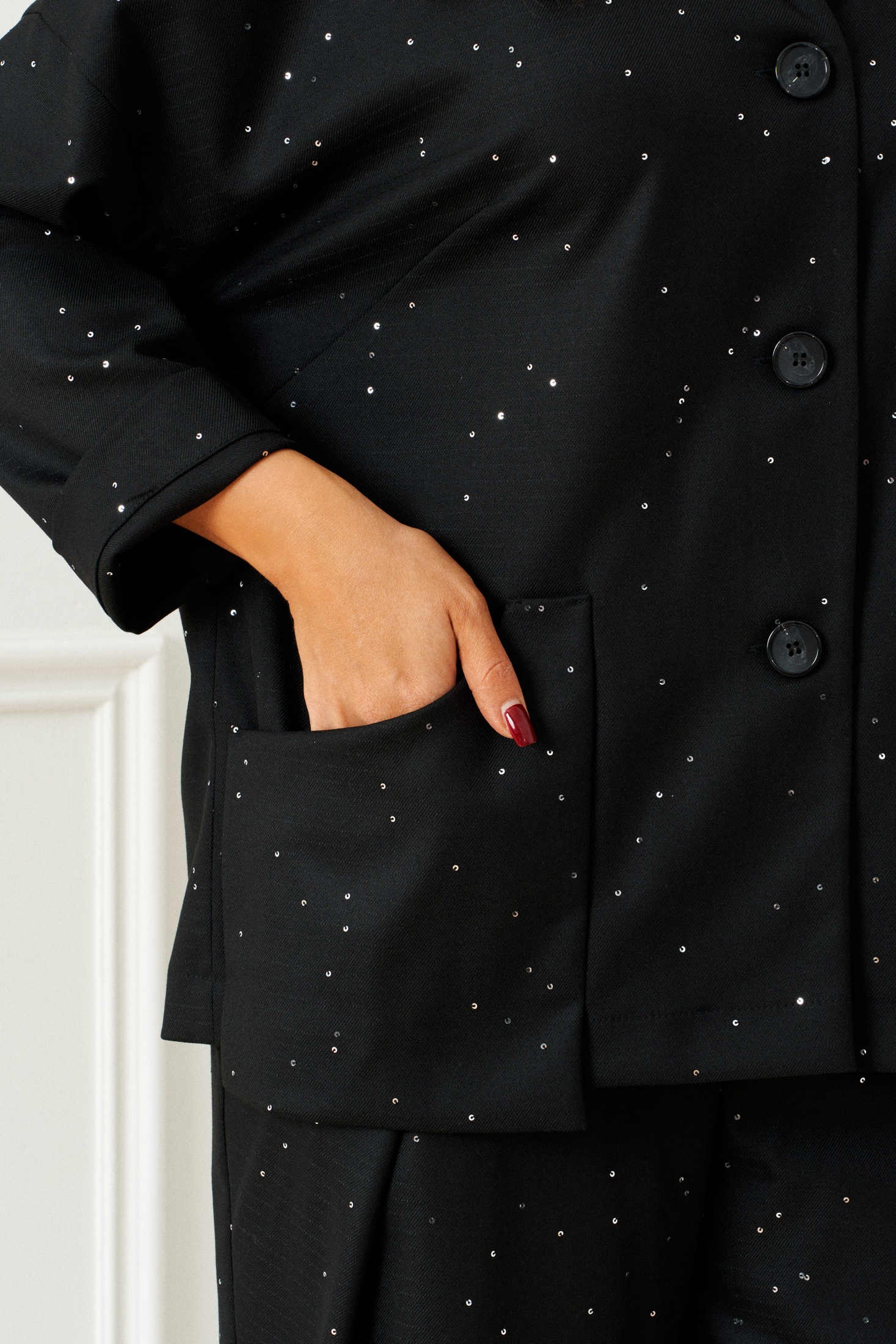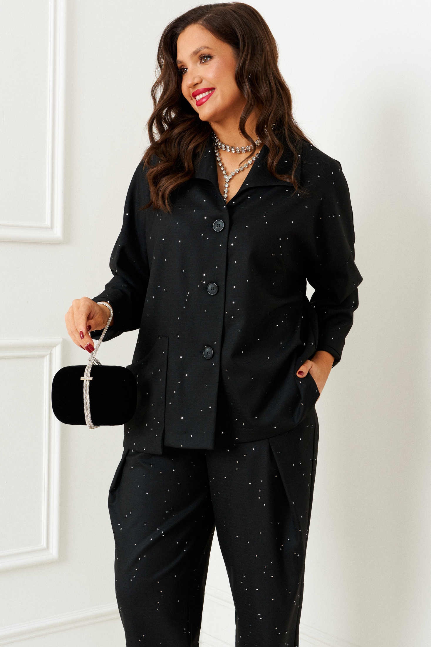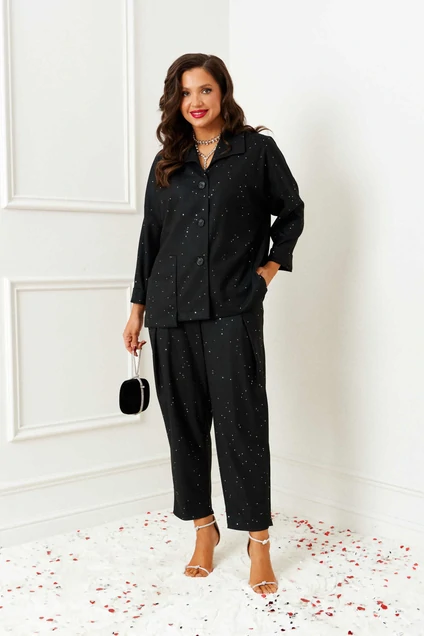 Костюм состоит из 2-х предметов одежды: рубашки и брюк. Выполнен из костюмной ткани стильного дизайна.