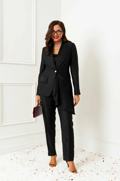 Жакет асимметричного кроя с акцентными фантазийными деталями, на подкладке.