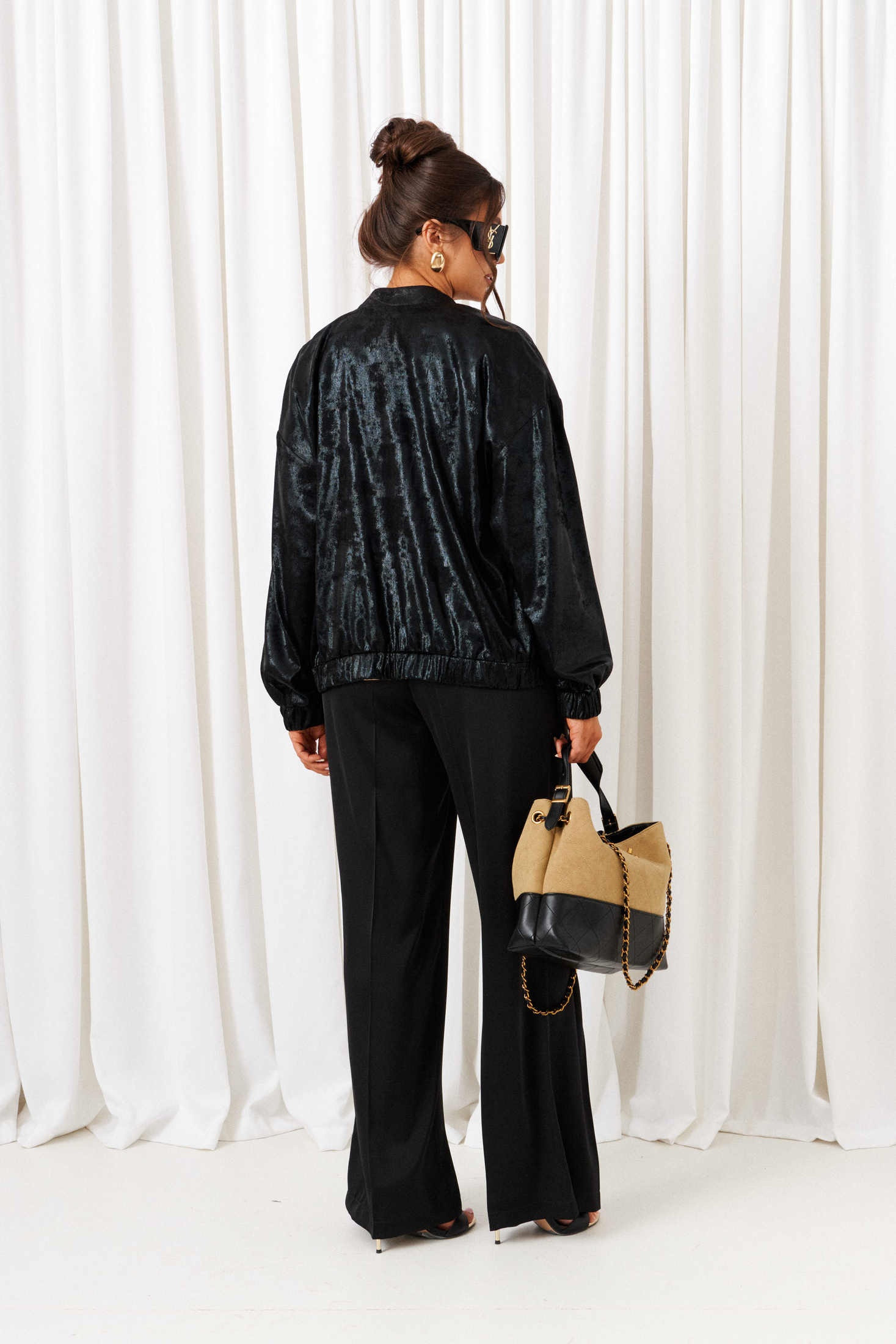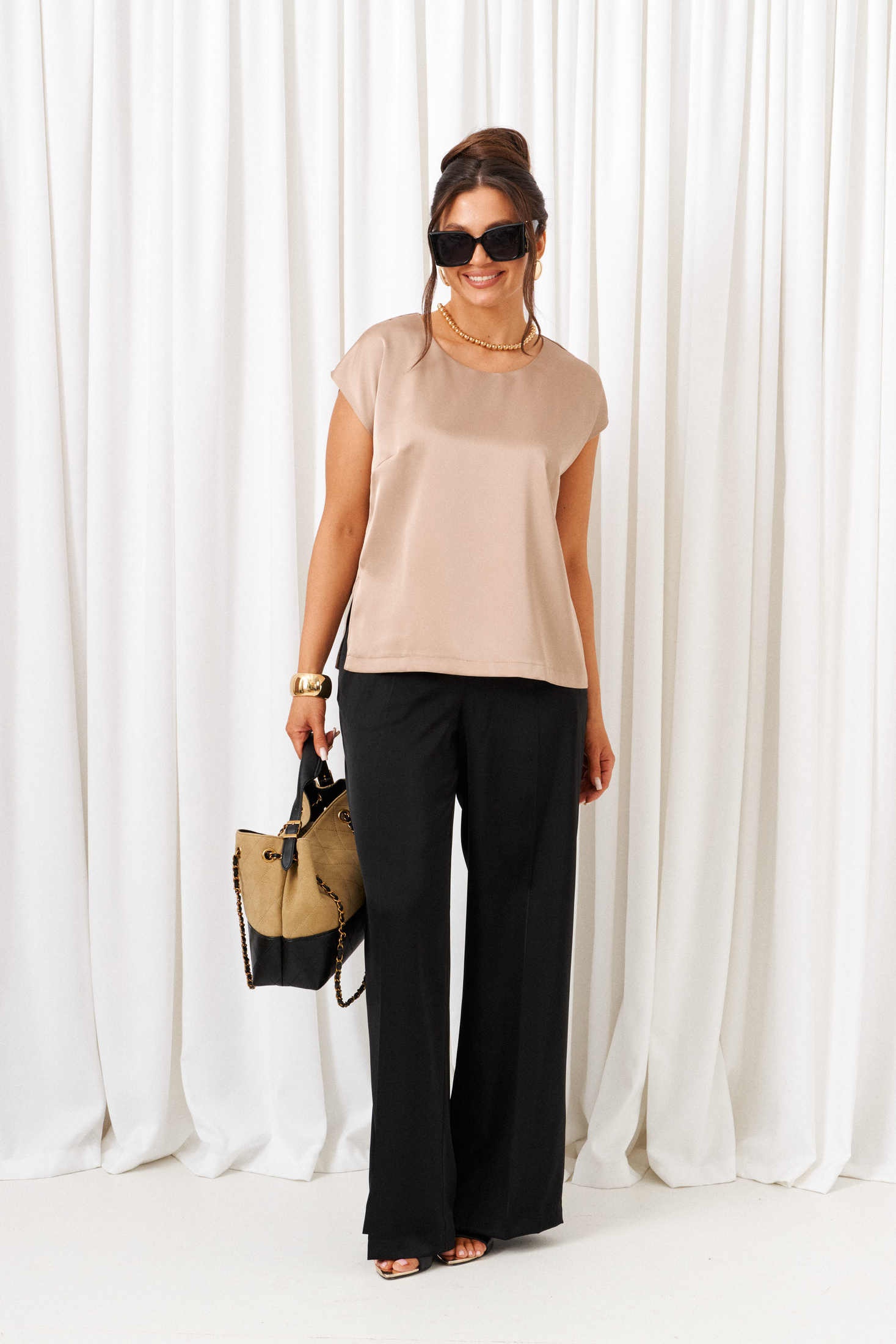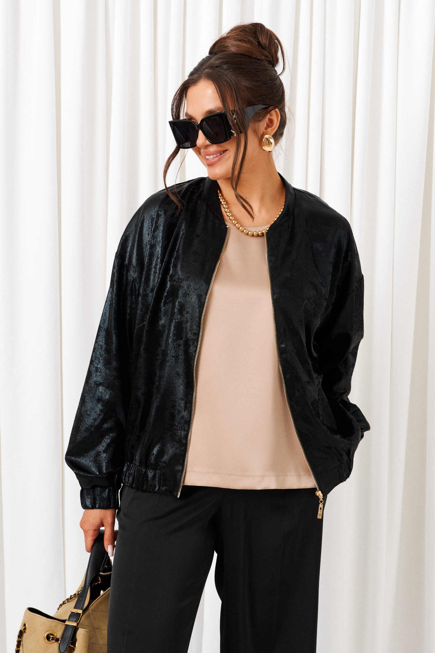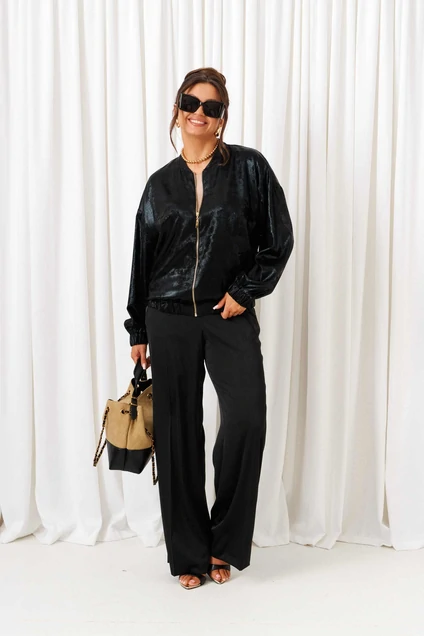 Костюм брючный 6427 черный-латте Beautiful&Free — это стильный выбор в коллекции бренда Beautiful&Free. Комплект сочетает в себе блеск атласа и эксклюзивность ворсового шифона, создавая элегантный и выразительный образ. Блузон свободного силуэта типа «бомбер» украшен удлиненной линией плеча и рубашечными длинными рукавами на манжетах с резинкой. Центральная застежка на декоративную молнию и воротник-стойка добавляют нотку современности. Брюки прямого кроя с классической высотой сиденья и удобными боковыми карманами обеспечивают комфорт. Верх легкого полуприлегающего силуэта с разрезами по бокам дополнен округлой горловиной. Черный цвет костюма с элементами латте придаёт образу утонченности и подходит для разных сезонов. Длина блузона — около 63 см, брюки — 108 см. Длина рукава блузона (+ плечо) ~ 72,5 см. Длина топа (по среднему шву спинки) ~ 60 см.