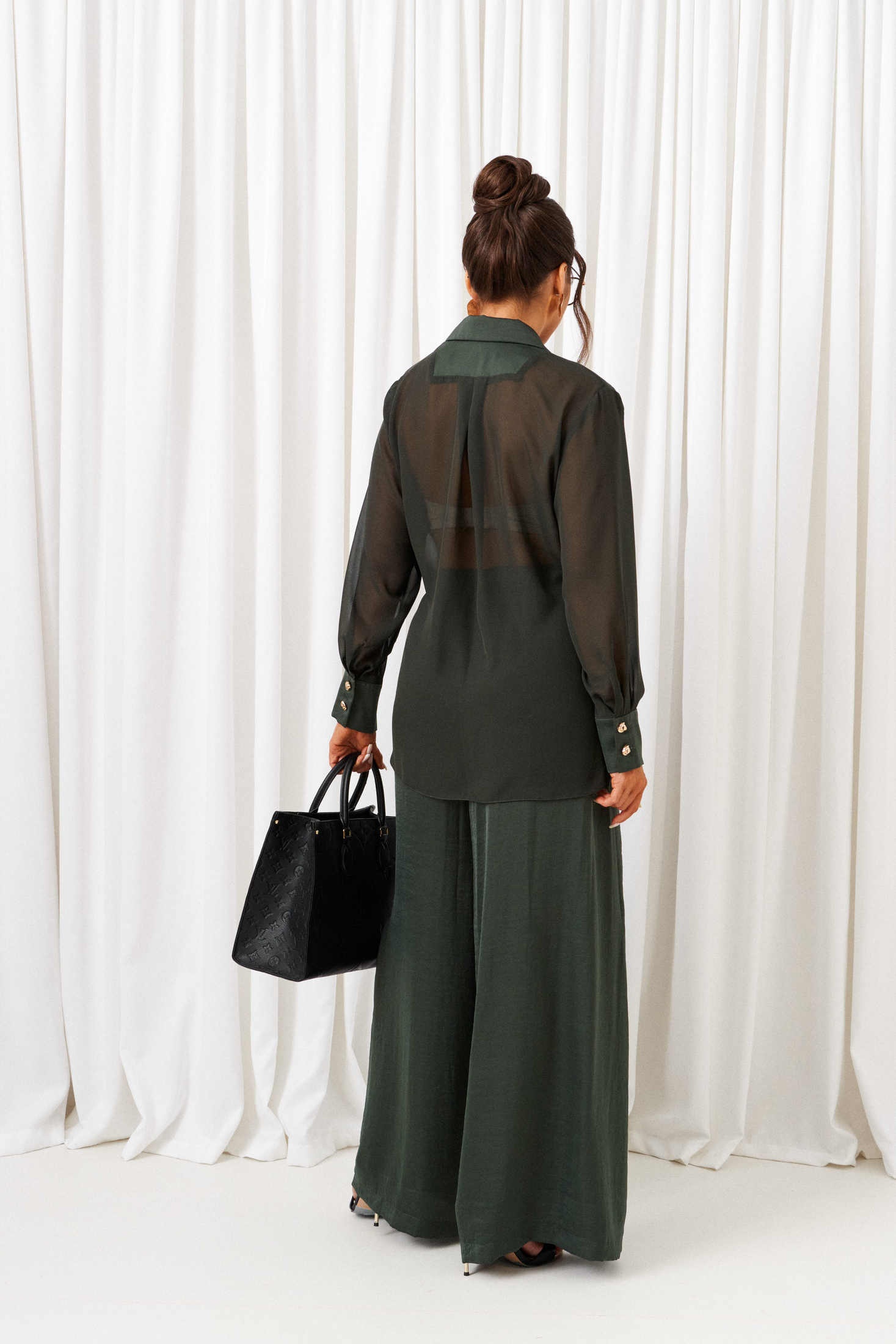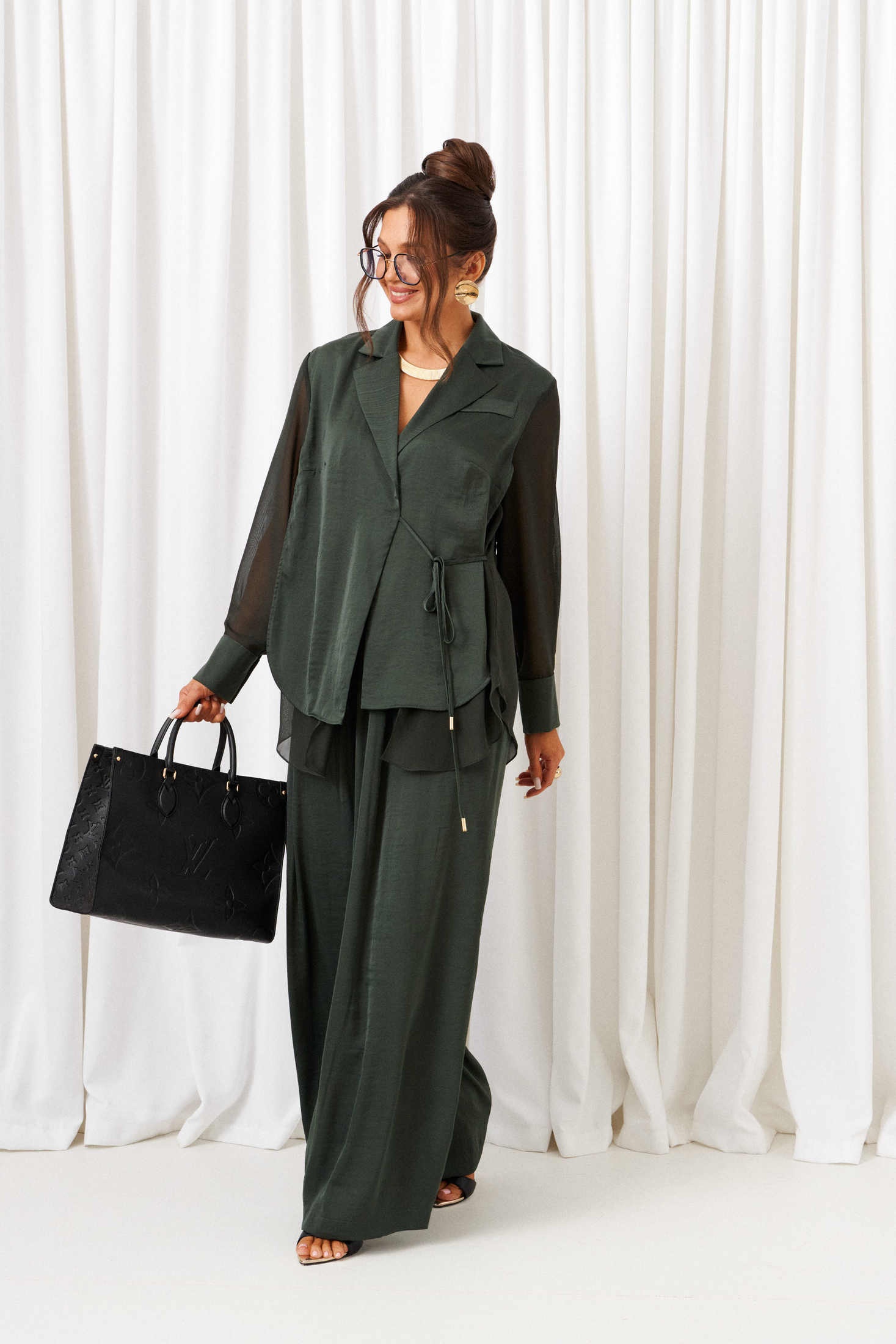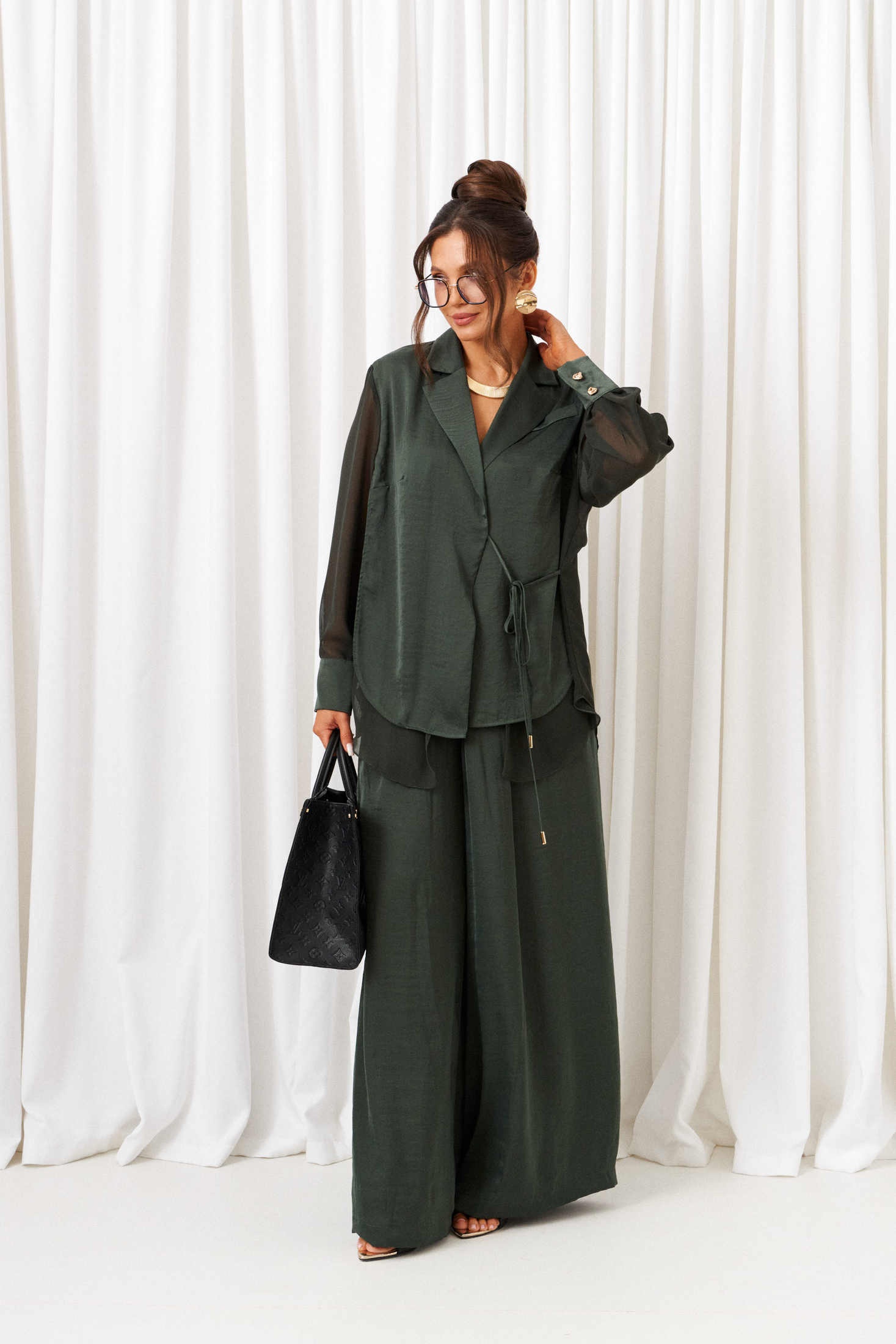 Костюм брючный 6428 шалфей Beautiful&Free представляет собой стильный комплект, идеально подходящий для нарядно-повседневных выходов. Коллекция бренда Beautiful&Free отличается легкими и струящимися тканями, такими как вискоза и полиэстер, создающими плавные движения и комфорт. Комплект включает рубашку и брюки, выполненные в светлых оттенках шалфея. Рубашка из шифона с мягкими складками и декоративной обтачкой-кокеткой имеет классический отложной воротник и застежку на завязку. Брюки с эластичным поясом и глубокими складками на талии обеспечивают свободу движений. Идеально подходит для осеннего сезона, благодаря своему легкому и воздушному фасону. Длина рубашки по спинке составляет около 76 см, а длина брюк — 108 см.