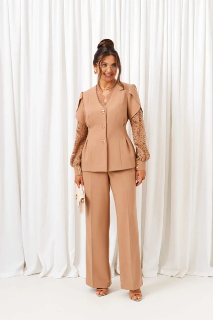 Костюм женский 2-ух предметный: жакет и брюки в деловом стиле. Выполнен из костюмного смесового полотна нежной и приятной фактуры с кружевной отделкой.