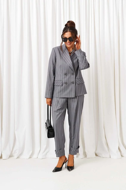 Костюм брючный 6435 светло-серый Beautiful&Free – это изысканное изделие из коллекции бренда Beautiful&Free. Выполнен из качественного костюмного полотна с вискозой, обеспечивая комфорт и стильный вид. Костюм включает двубортный жакет полуприлегающего силуэта с декоративными боковыми карманами и пиджачный воротник с лацканами. Длина жакета по спинке составляет 65,5 см, что добавляет образу элегантности. Брюки имеют свободный крой сверху и слегка зауженные к низу, с декоративными патами и карманами для удобства. Центральная застёжка на молнию и пуговицы дополняет стильный облик. Светло-серый цвет в полоску делает его подходящим как для офисного дня, так и для торжественных случаев. Длина брюк с поясом 96 см идеально подчеркивает фигуру и придаёт завершенности всему образу.