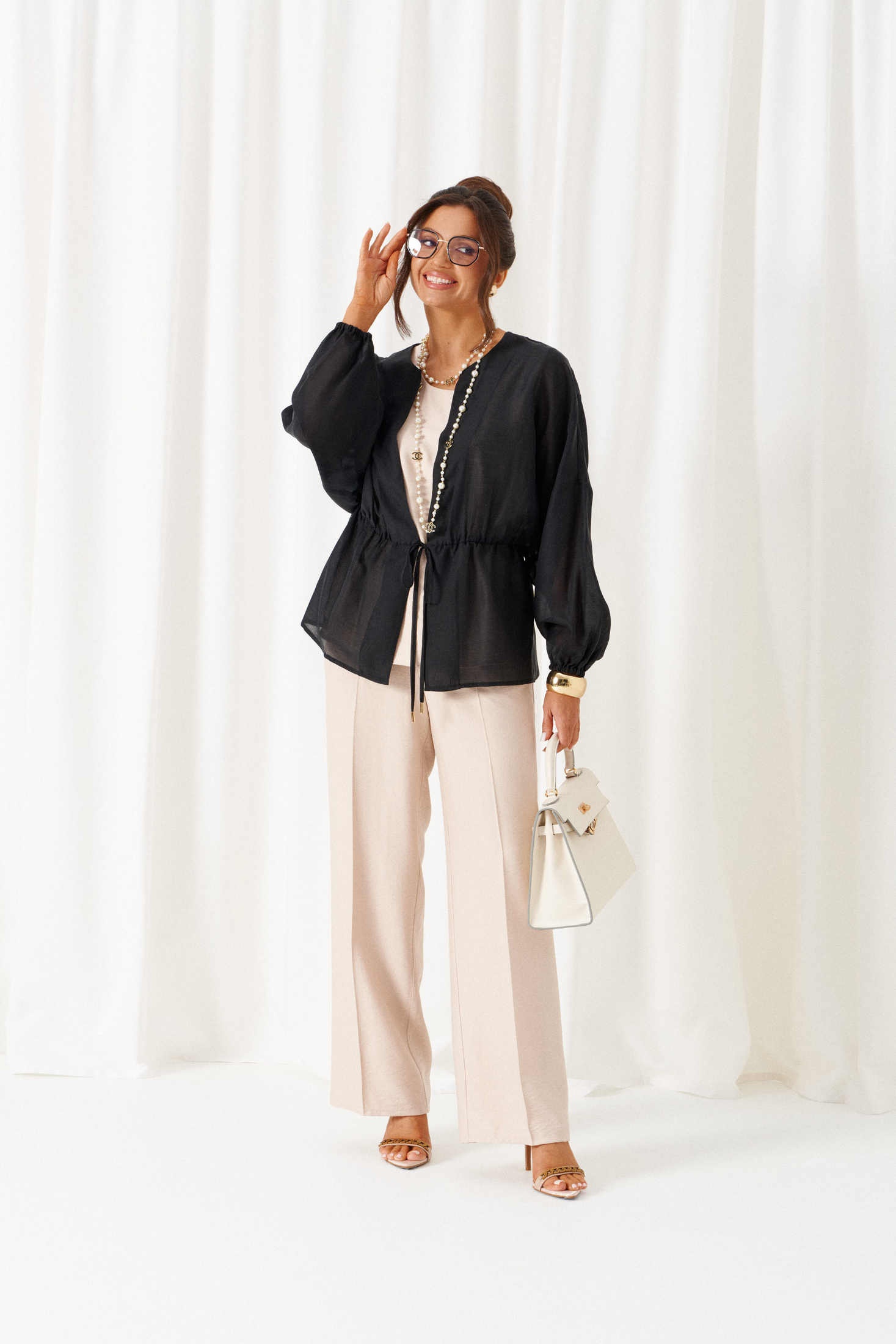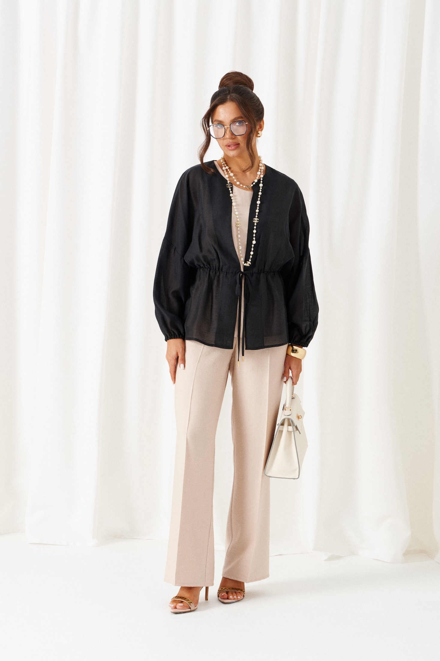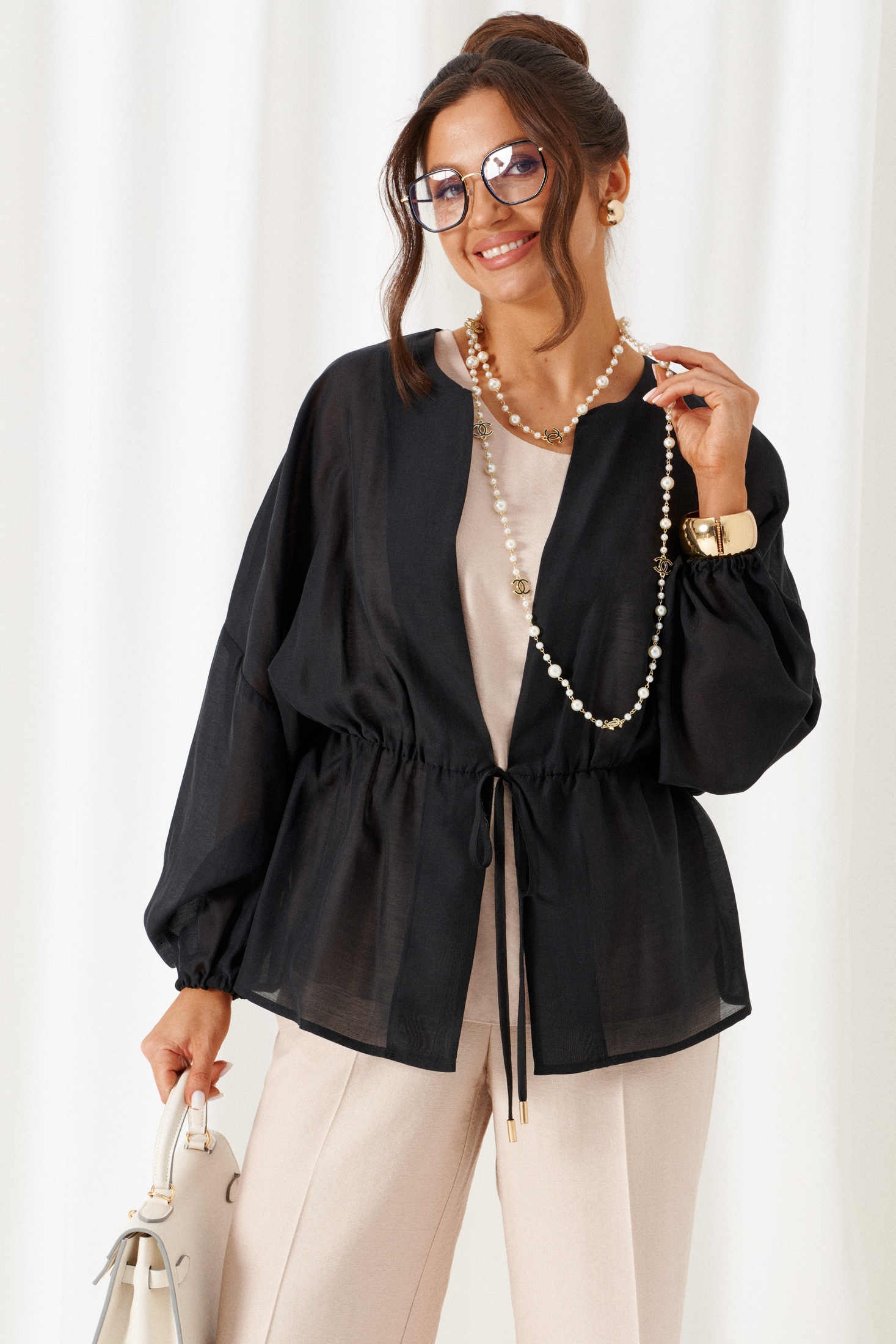 Костюм брючный 6448 бежево-черный Beautiful&Free — это идеальное решение для повседневного гардероба. Коллекция бренда Beautiful&Free предлагает стильную и комфортную тройку, состоящую из блузки, брюк и топа. Изделия выполнены из смесовой ткани с добавлением натуральных волокон, обеспечивая дышащий эффект и комфорт на протяжении всего дня. Блузка-жакет из вуали обладает свободным силуэтом и фиксируется по талии на завязки, добавляя утонченности. Брюки прямого кроя с классической посадкой и двумя боковыми карманами, дополнены центральной застежкой на молнию и пуговицу. Топ полуприлегающего силуэта завершает образ. Цветовая гамма сочетает в себе бежевые и черные тона, подходящие для любого времени года. Длина по спинке блузки составляет 68 см, топа — 62,5 см, а брюки достигают 108 см по боковому шву.