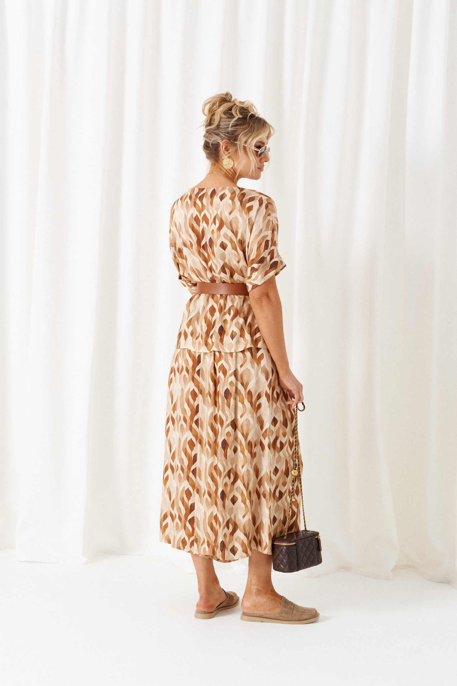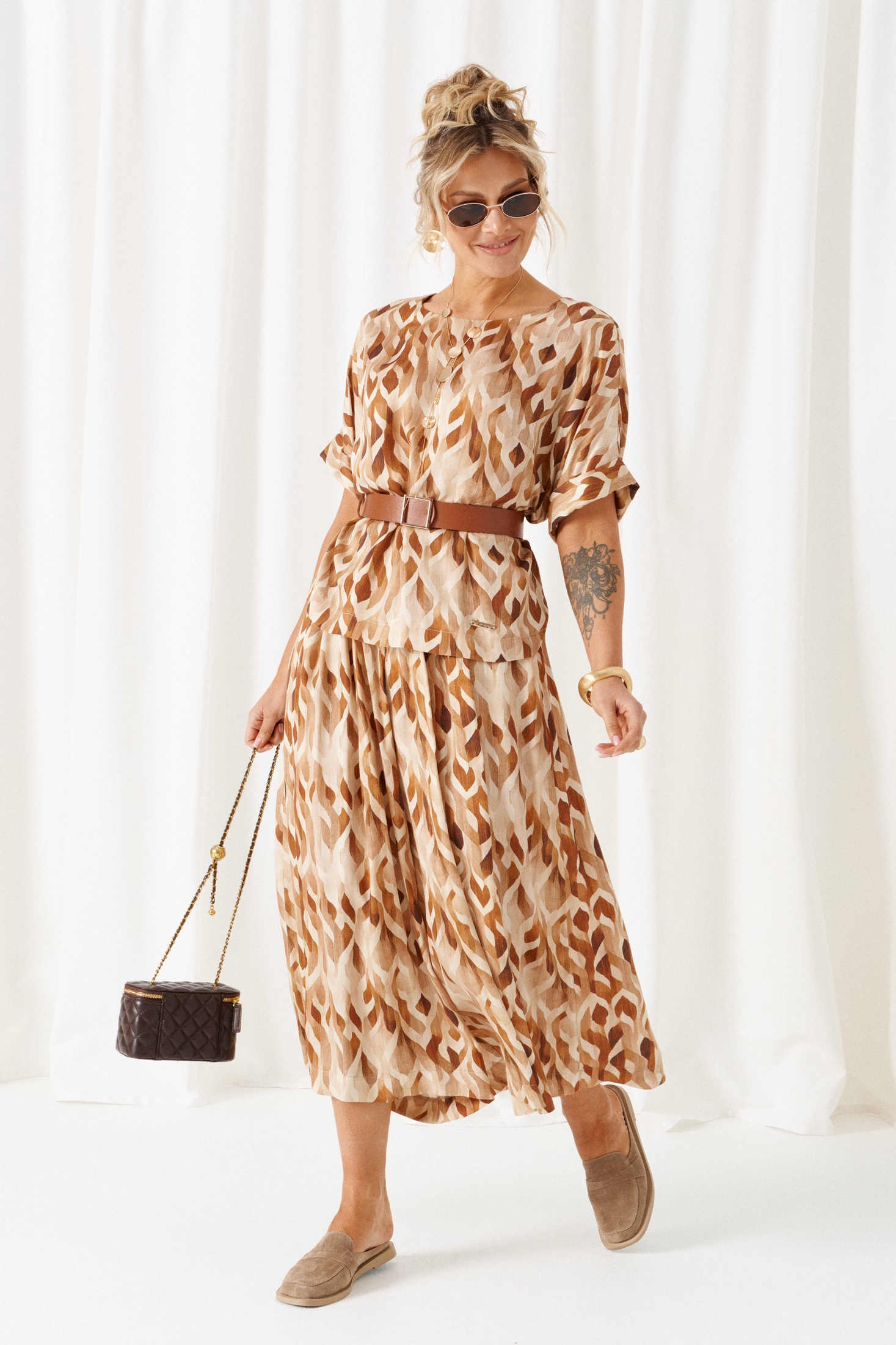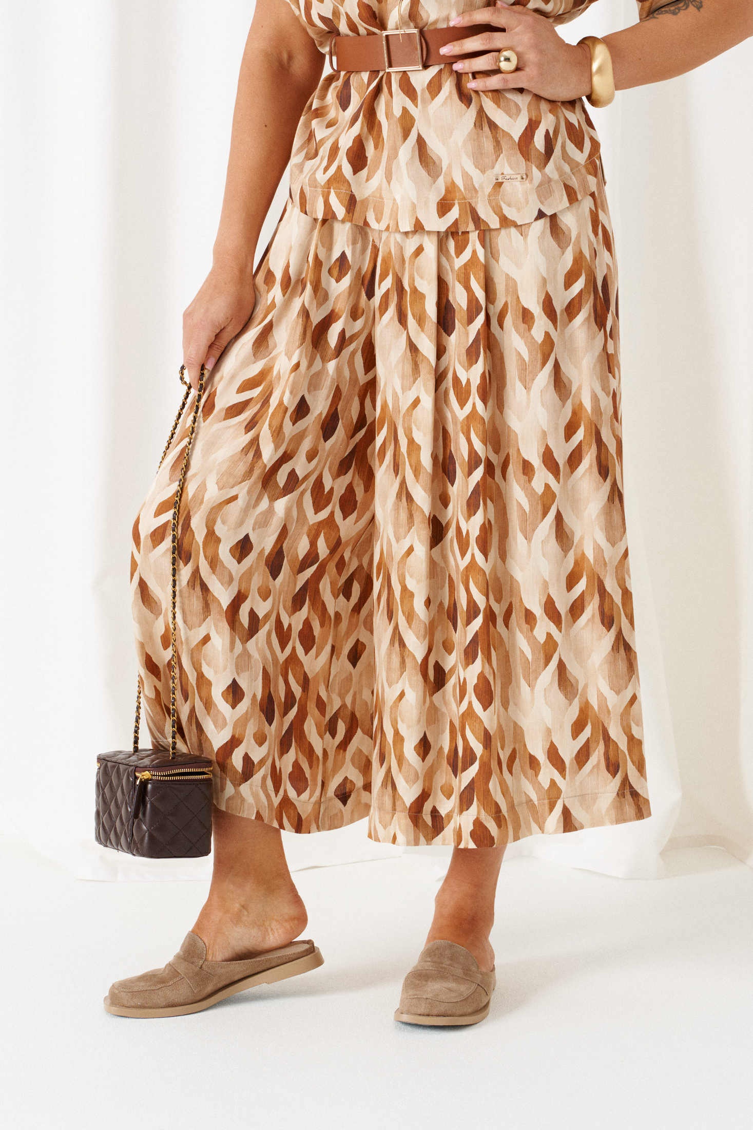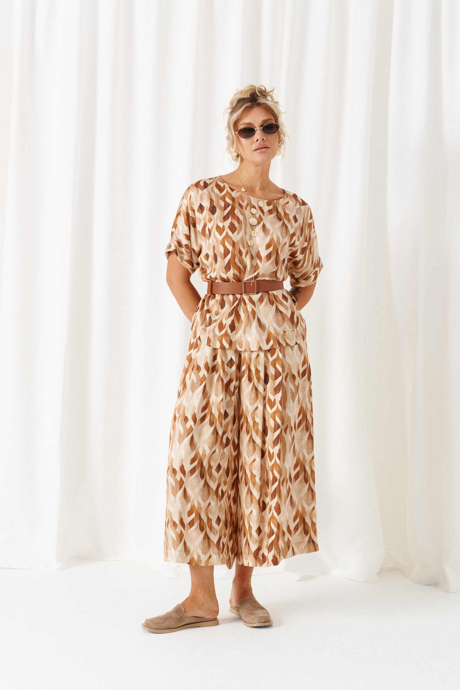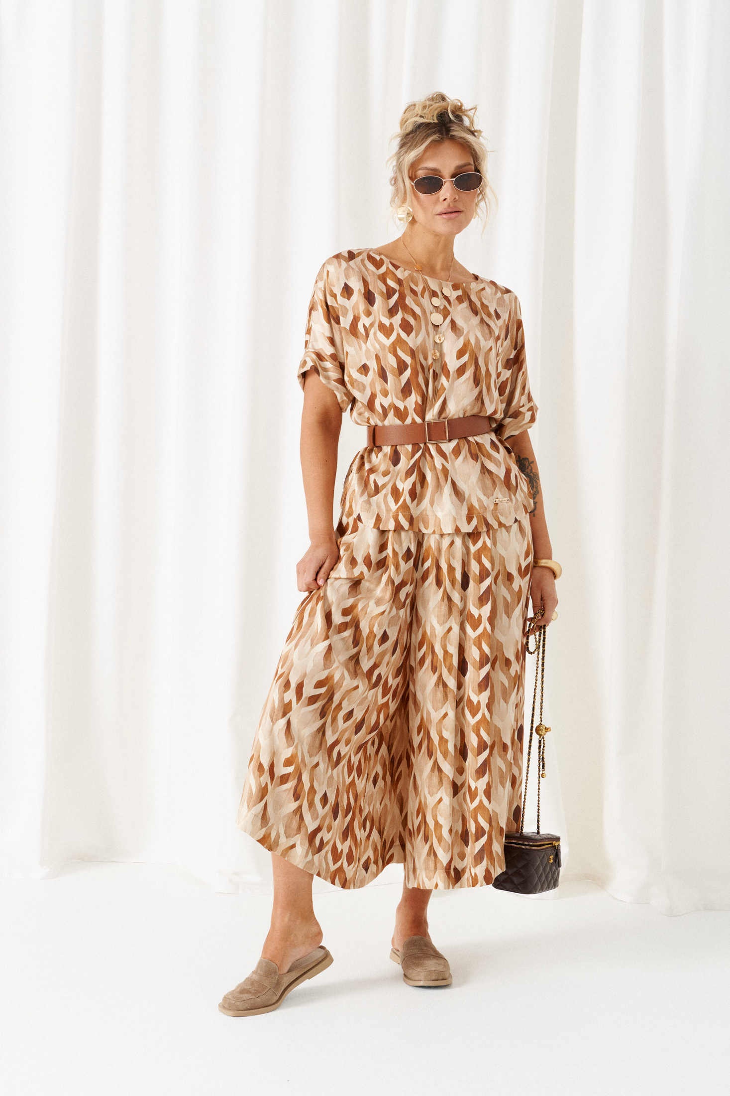 Костюм брючный 6464 бежево-ореховый Beautiful&Free – это удивительное сочетание стиля и комфорта. Коллекция бренда предлагает женственный легкий костюм из натуральной вискозы, который станет идеальным выбором для весенне-летнего сезона. Блуза полуприлегающего силуэта с округлым вырезом и коротким цельнокроеным рукавом придает образу нежность. Длина по спинке составляет 61,5 см, рукав – 32 см с плечом. Юбка-брюки миди длины подчеркивают современный стиль, при этом обеспечивая свободу движений. Общая длина юбки-брюк составляет 87 см. Декоративный пояс с пряжкой и металлический элемент добавляют акценты, придающие костюму завершенность. Бежево-ореховая палитра и расслабленный крой делают костюм идеальным для повседневных прогулок и отдыха.