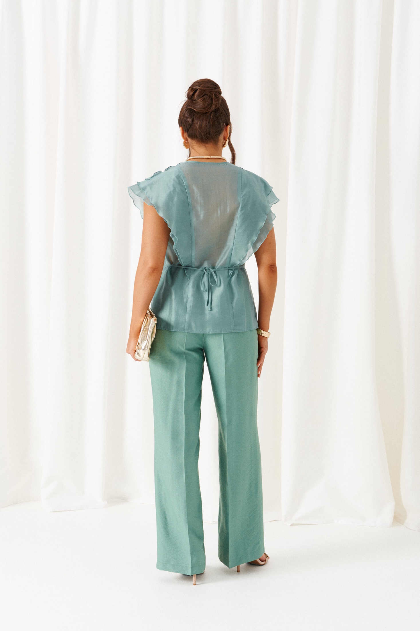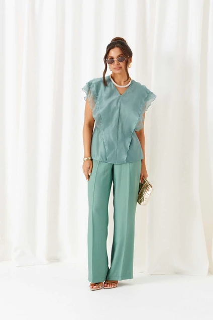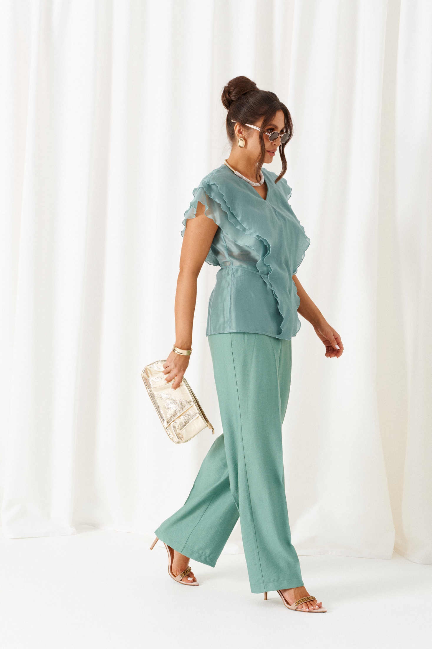 Костюм брючный 6467 мята Beautiful&Free станет ярким акцентом вашего гардероба. Коллекция бренда Beautiful&Free предлагает элегантный комплект в романтическом стиле. Блузка из вискозы и нейлона с полуоблегающим силуэтом дополнена несъемным поясом-завязкой для идеальной посадки по талии. V-образный вырез и тройные воланы добавляют легкость образу. Брюки из льна и вискозы отличаются классическим кроем и удобной резинкой на поясе, обеспечивающей комфорт в носке. Длина блузки 63 см, брюки имеют длину 108 см. Освежающий мятный цвет костюма идеально подойдет для теплых летних дней и подчеркнет вашу индивидуальность.