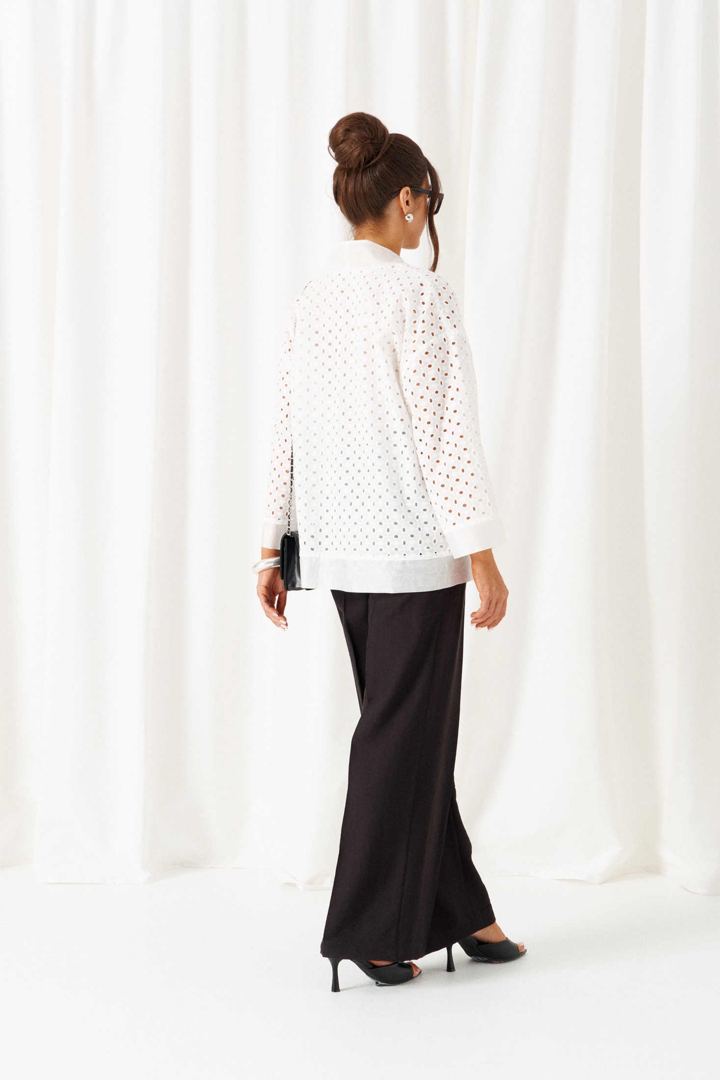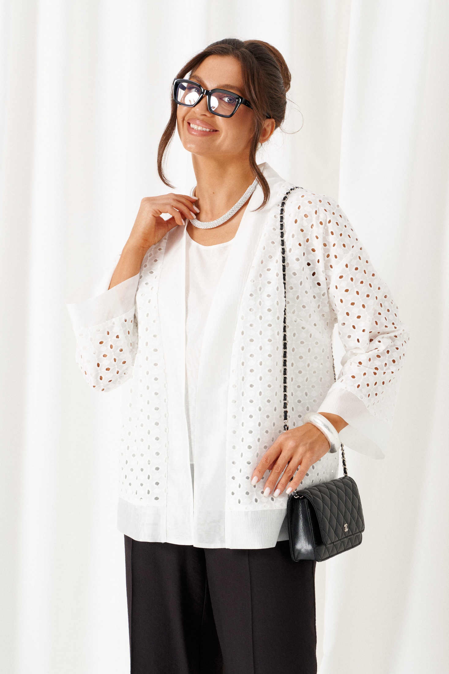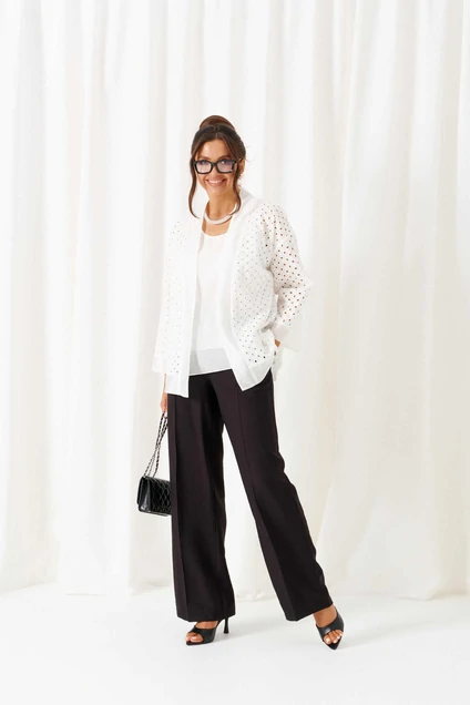 Костюм брючный 6469 бело-черный Beautiful&Free — идеальное решение для весенне-летнего сезона. Коллекция бренда Beautiful&Free предлагает стильный комплект, сочетающий хлопковый жакет с эффектным шитьем и брючный костюм из льна и вискозы. Жакет свободного силуэта напоминает кардиган с удлиненной линией плеча и рубашечными рукавами 7/8, длиной 65,5 см. Его спинка выполнена цельнокроено, а передняя часть дополнена нагрудными вытачками. Свободные брюки с классической высотой сиденья и длиной 108 см, оснащены боковыми карманами и застежкой на молнию. Топ полуприлегающего силуэта завершает ансамбль, идеально подходящий для деловых встреч или прогулок. Яркость белого цвета жакета и классическое черное брюки создают непревзойденный контраст.