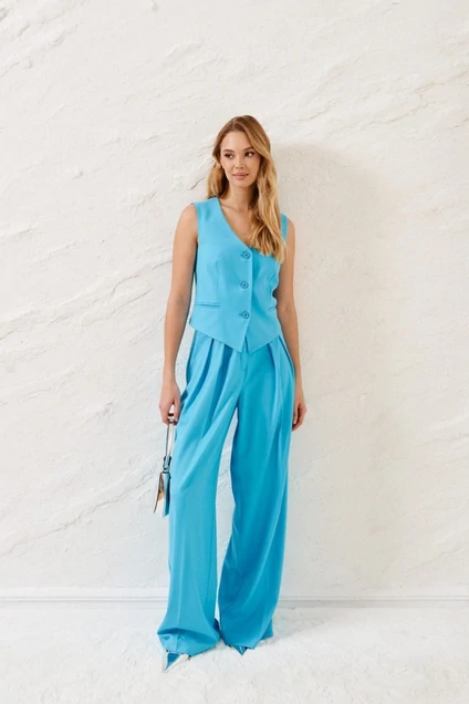 Комплект состоит из укороченного жилета и брюк выполнен из костюмной ткани насыщенного синего цвет. Характеристики жилет однобортный, прямой крой, подкладка, остроугольные лацканы, прорезные карманы обманки, застежка центральная на петли - пуговицы, низ изделия по переду с фигурным низом. Длина по спинке 44 см. Брюки прямой крой, пояс стабильный, по поясу нашиты шлевки, декоративная сборка по передней части, заутюженные стрелки по передней и задней части брюк. Длина изделия 114 см.