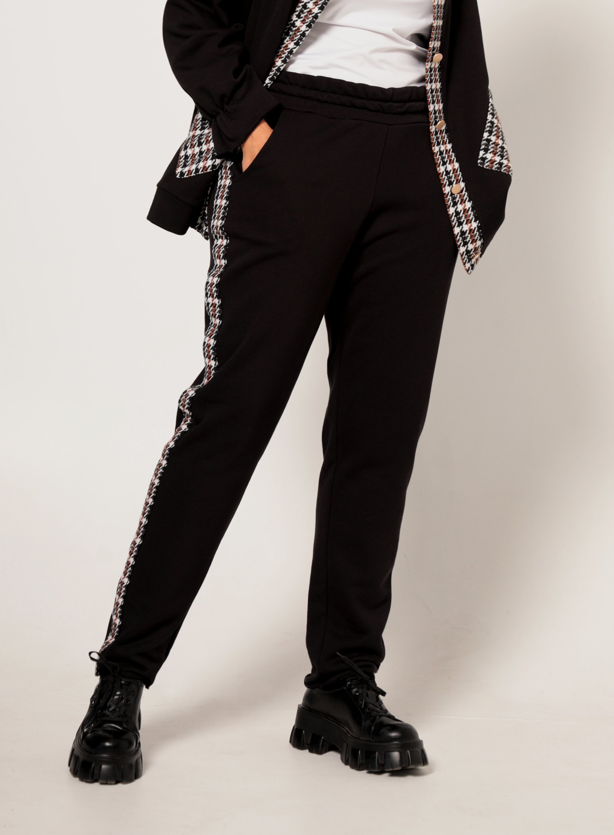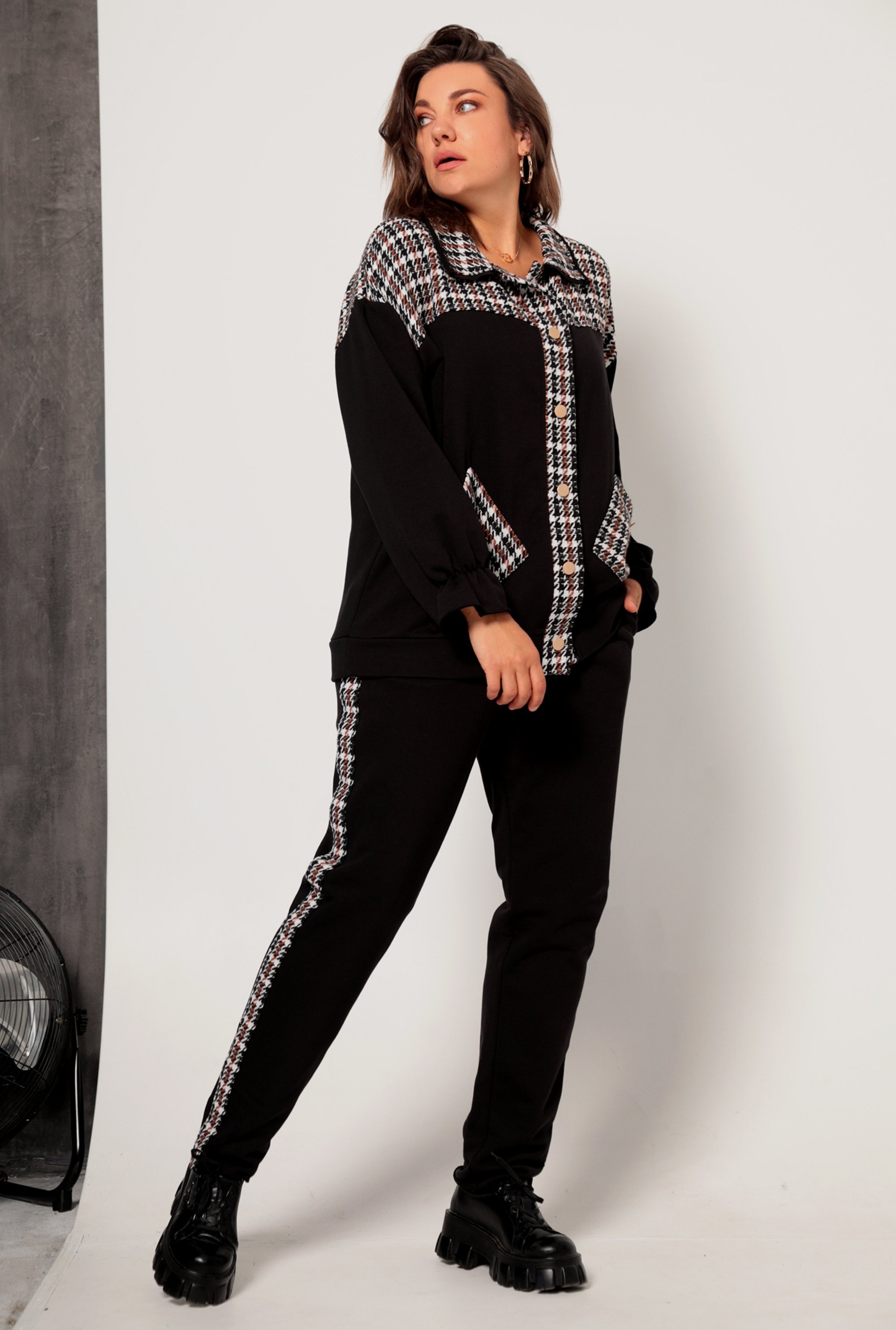 Костюм брючный 3031 BegiModa. Коллекция бренда BegiModa предлагает уникальный женский комплект из бомбера и брюк, выполненный из хлопкового трикотажа и костюмной ткани. Контрастные вставки из гусиной лапки и золотистые элементы придают костюму стильный и современный вид. Черный трикотаж и декоративные карманы делают модель эффектной и привлекающей внимание. Втачной воротник с необычной обработкой и рукав со спущенной проймой, собранный резинкой по низу, подчёркивают модный фасон. Брюки имеют лампасы и карманы с отрезным бочком, обеспечивая удобство и хорошую посадку. Этот костюм — идеальный выбор для прохладного времени года, благодаря материалам, которые предохраняют от ветра и холода. Цветовая гамма — универсальный черный — легко сочетается с другими элементами гардероба, создавая непревзойденный образ для любой обстановки.