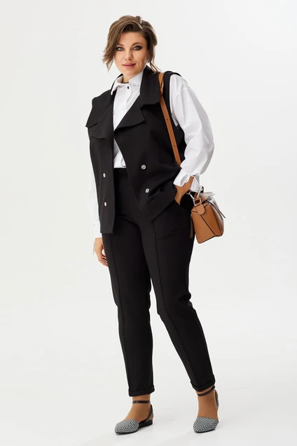 Стильный женский комплект, полуприлегающего силуэта, состоящий из жилета и брюк. Без подкладки. Выполнен из плотного трикотажа, который растяжим и хорошо держит форму, что помогает скрыть недостатки фигуры.