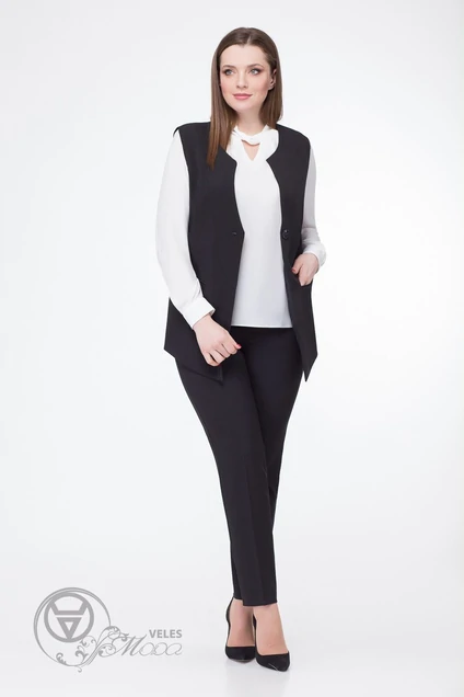Жилет женский, полуприлегающего силуэта, с фигурным краем борта, с центральной застёжкой на петлю и пуговицу, с рельефными швами, с прорезными карманами в рамку. Спинка с рельефными швами и со средним швом. Жилет длиной до середины бедра, с удлинённым низом и с притачной подкладкой по переду. По рельефным швам переда и спинки проложены отделочные строчки. Низ спинки обработан на подшивочной машине. Брюки женские полуприлегающие, от линии колена более прямые к низу, по среднему шву с застежкой на тесьму-молнию, на притачном поясе, который застегивается на две петли и пуговицы. Брюки с фигурными вставками и карманами с листочкой на передних половинках, с имитацией кармана, с отрезной кокеткой на задних половинках. Брюки длинные, классические. Украшением брюк служит металлическая лейба, пришитая на левый карман передних половинок. Длина спинки 65-67 см Длина брюк 100 см
