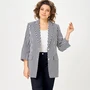 Комплект женский, 2-х предметный, состоит из жакета и и брюк. Жакет женский удлиненный, из текстильной ткани, на подкладке, полуприлегающего силуэта с центральной бортовой застежкой на пуговицы до линии перегиба лацкана. Спереди рельефные швы от плечевого шва, отрезной бочок и карман с клапаном. Спинка с рельефами от плечевого шва. Рукав втачной, двухшовный, по низу рукава обработана шлица на петли-пуговицы. Воротник пиджачного типа. Длина по спинке 66 см, длина рукава 62 см. Брюки прямые,классические, с заутюженными стрелками, по переду обработаны карманы с отрезным бочком, застежка на тесьму-молнию и 1 пуговицу. На задних половинках обработаны вытачки и имитация карманов с листочкой, пояс в брюках притачной. Длина брюк от талии по боковому шву 105 см.