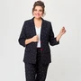 Комплект женский-двойка, из текстильной ткани, жакет удлиненный, полуприлегающего силуэта с центральной бортовой застежкой на пуговицы до линии перегиба лацкана. Спереди рельефные швы от плечевого шва, отрезной бочок и карман с клапаном. Спинка с рельефами от плечевого шва. Рукав втачной, двухшовный. Воротник пиджачного типа. Жакет на подкладке, длина по спинке 67 см, длина рукава 62 см. Брюки прямые, классические, с заутюженными стрелками, по переду обработаны карманы с отрезным бочком, застежка на тесьму-молнию и 1 пуговицу. На задних половинках обработаны вытачки и имитация карманов с листочкой, пояс в брюках притачной. Длина брюк от талии по боковому шву 103 см. Брюки хлопок 60%, полиэстер 37, эластан 3%