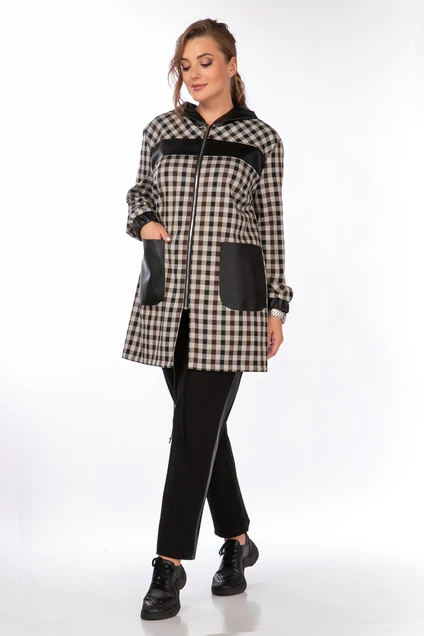 Комплект женский двухпредметный состоит из рубашки и брюк. Рубашка прямого силуэта,выполнена из текстильной ткани в сочитании с экокожей.На полочке накладные карманы,с капюшоном,без подкладки,по переду застежка молния.Длина рубашки по спинке 80см.,длина рукава 60 см. Брюки полуприлегающего силуэта из трикотажа с лампасами из экокожи,пояс на резинке,с карманами.Длина брюк 102 см.
