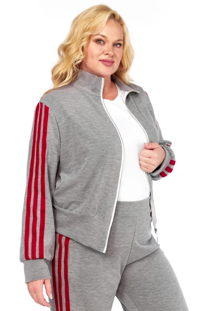 Двухпредметный женский костюм, идеальный выбор для комфортного, но стильного образа. Комплект состоит из джемпера и прямых брюк. Джемпер серого цвета застегивается на молнию, имеет спущенные рукава с манжетами и функциональные карманы на полочке, украшен контрастными красными лампасами, добавляющими изюминку в дизайн. Брюки также выполнены в сером цвете и декорированы красными лампасами по бокам, оснащены удобными карманами в боковых швах и эластичным поясом для оптимального комфорта. Этот костюм идеально подойдет для активного дня или расположенного отдыха, сочетая в себе удобство и современный стиль.