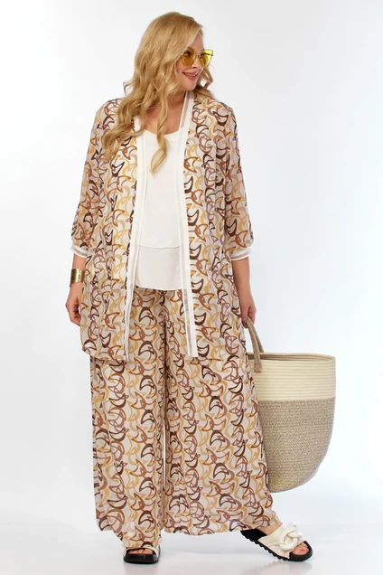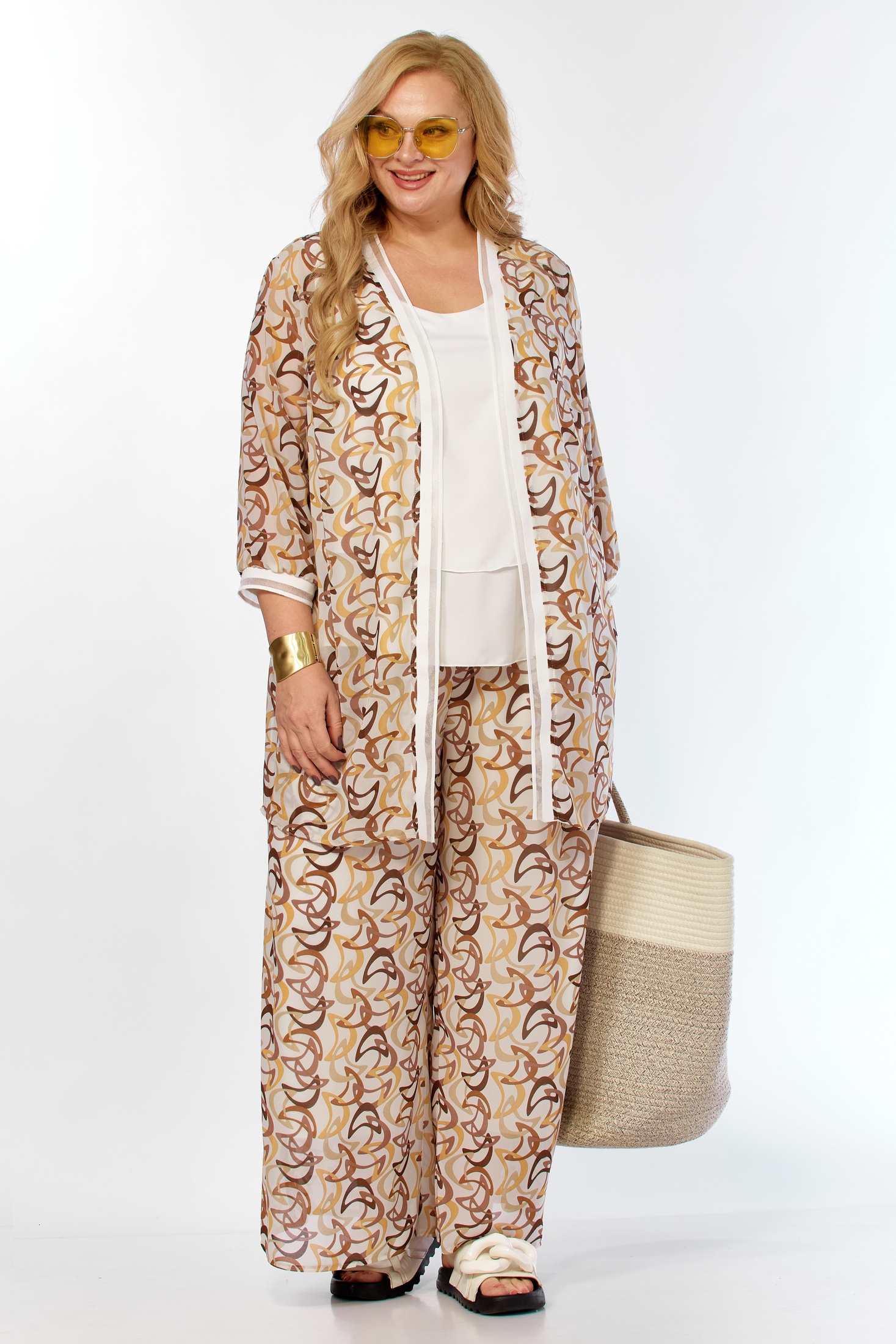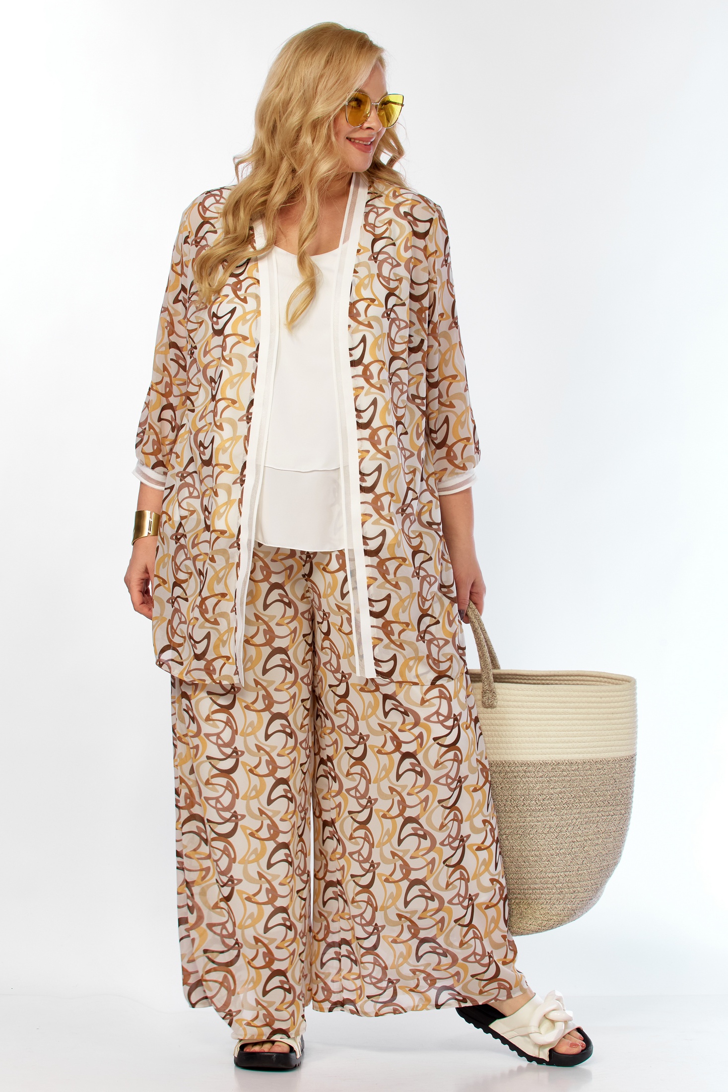 Костюм брючный 2335 песок Belinga — это идеальный выбор для стильных женщин. Коллекция бренда Belinga предлагает костюм из 100% полиэстера, что делает его лёгким и удобным для носки. Костюм состоит из трех предметов: кардигана с втачным рукавом и разрезами по бокам, брюк с резинкой на талии и двойной блузки без рукавов. Декоративные довязи на передней части и рукавах добавляют оригинальности. Летний комплект отлично подходит для прогулок, благодаря свободному крою и натуральным оттенкам. Комфортная посадка и карманы в боковых швах обеспечивают практичность. Песочный цвет и геометрический рисунок делают комплект привлекательным для любого случая.
