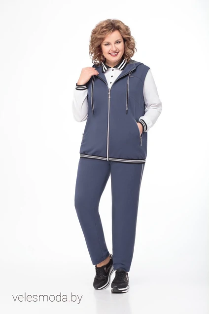 Элегантный женский комплект выполнен в спортивном стиле, из трикотажного полотна. Комплект состоит из жилета, брюк и блузы.