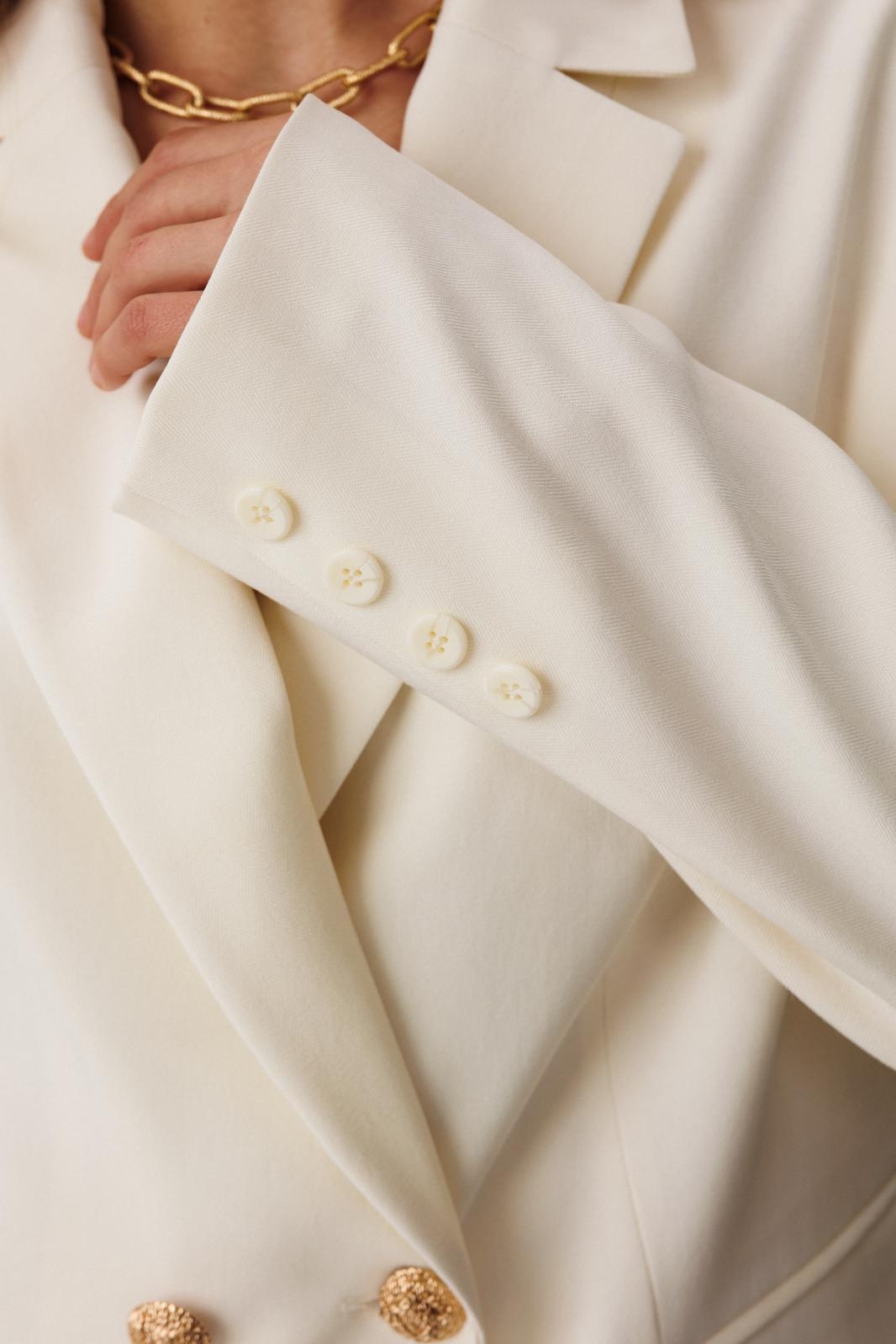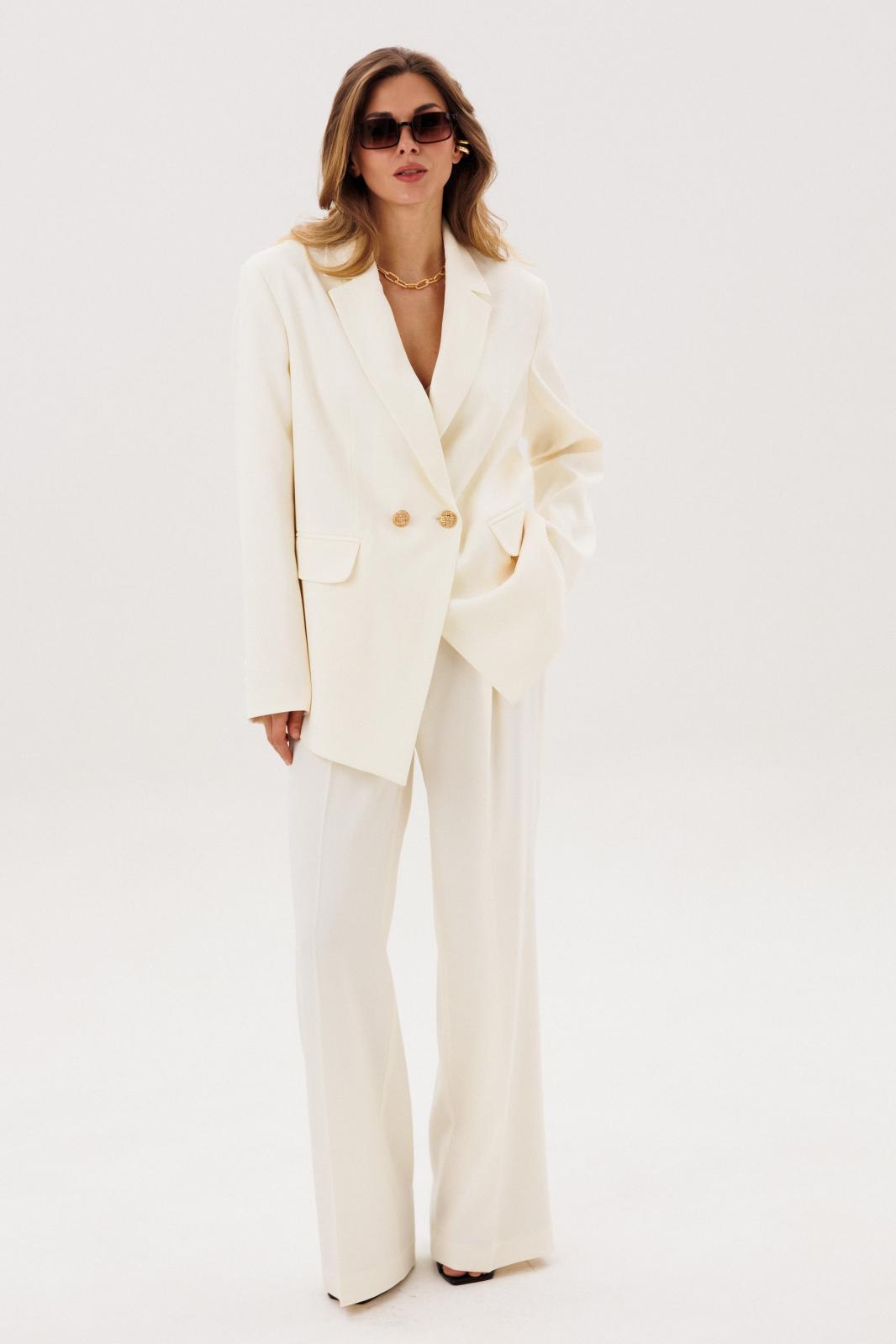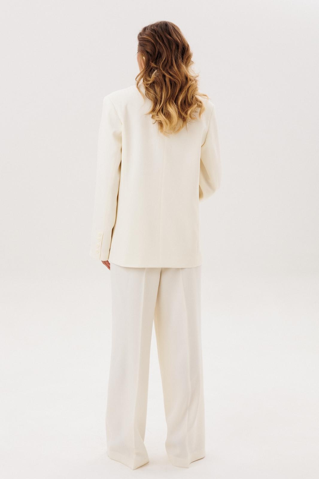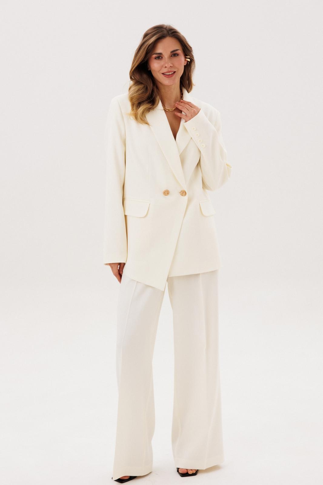 Костюм брючный 1088 COCKTAIL — элегантное решение для стильных женщин. Коллекция бренда COCKTAIL представляет классический брючный костюм из жаккардовой ткани с узором «елочка» молочного цвета. Жакет прямого силуэта с двубортной застежкой, прорезными карманами и асимметричным низом придаёт образу уникальности. Брюки палаццо с застежкой на молнию и поясом с резинкой обеспечивают комфорт и легкость движения. Легкие рельефы и вытачки создают идеальную посадку. Являясь универсальным элементом вашего гардероба, этот наряд подходит для деловых встреч и повседневного ношения в весенне-летний период.