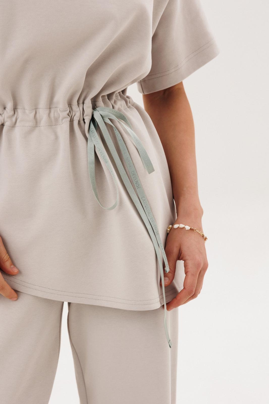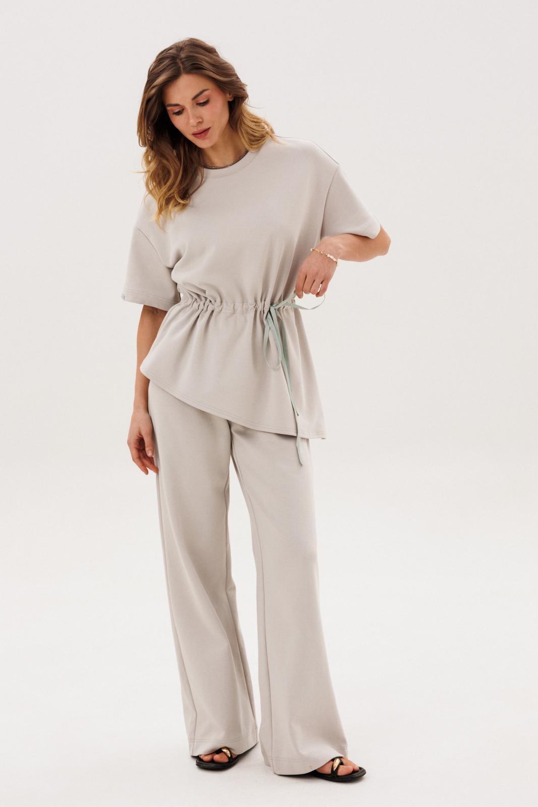 Костюм брючный 1092 COCKTAIL — отличный выбор для повседневных образов. Коллекция бренда COCKTAIL предлагает удобство и стиль благодаря трикотажному материалу с добавлением хлопка и полиэстера, что способствует комфорту при носке. Джемпер имеет прямой силуэт, кулису по талии и асимметричную линию низа с контрастной тесьмой. Округлый вырез горловины обработан планками, а короткие рукава делают модель подходящей для теплого времени года. Прямые брюки с притачным поясом на резинке и боковыми карманами дополняют образ. Светлый тон костюма делает его универсальным вариантом для любого гардероба.