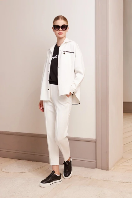 Брюки с посадкой на талии, пояс из отделочной эластичной тесьмы с застёжкой на декоративную молнию в шве сидения. Передние половинки с карманами, наклонными к боковым швам и застроченными стрелками. Задние половинки без особенностей.
