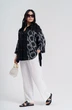 Комплект женский двухпредметный. Блуза свободного покроя из легкой вискозной принтованой ткани комбинированой с однотоном . Воротник рубашечный, застежка на петли и пуговицы. Рукав на базе спущенного по низу с отворотом и патой. Низ асимметричный, в боковых разрезы. Длина по спинке - см. Брюки свободного покроя, прямые от бедра. В боковых швах - карманы с отрезным бочком. Пояс- отрезной с эластичной тесьмой. Длина от линии талии с учетом пояса - см. Блуза: Вискоза-100%.