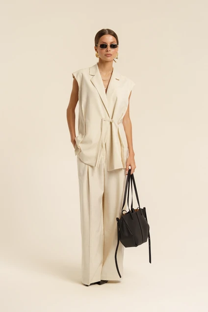 Комплект женский двухпредметный из вискозной ткани с добавлением льна. Жилет с расширенной линией плеч. Вырез горловины оформлен воротником пиджачного типа. Застежка с глубоким запахом на навесную петлю с пуговицей. Спереди в области талии- мягкие складки с пуговицей, фиксирующей направление. Длина жилетки по спинки от линии горловины - 73 см. Брюки свободного покроя со стрелками. На передних половинках в области талии- мягкие складки. Пояс изделия- отрезной, частично с эластичной тесьмой. Застежка- на молнию и петлю с пуговицей. Имеются шлевки для ремня. В боковых швах- карманы с отрезными бочками. Длина брюк по боковому с поясом - 110 см.