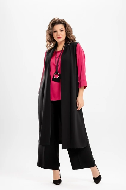 Жилет свободного покроя без застежки. Вырез горловины оформлен отложным воротником, переходящим в декоративную планку. Длина спинки - 114 см.