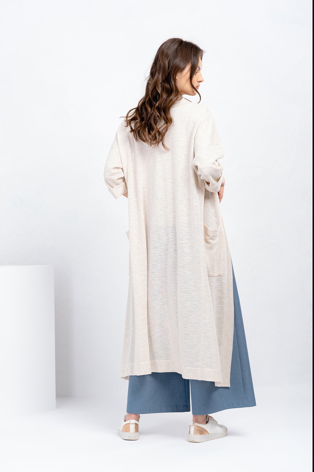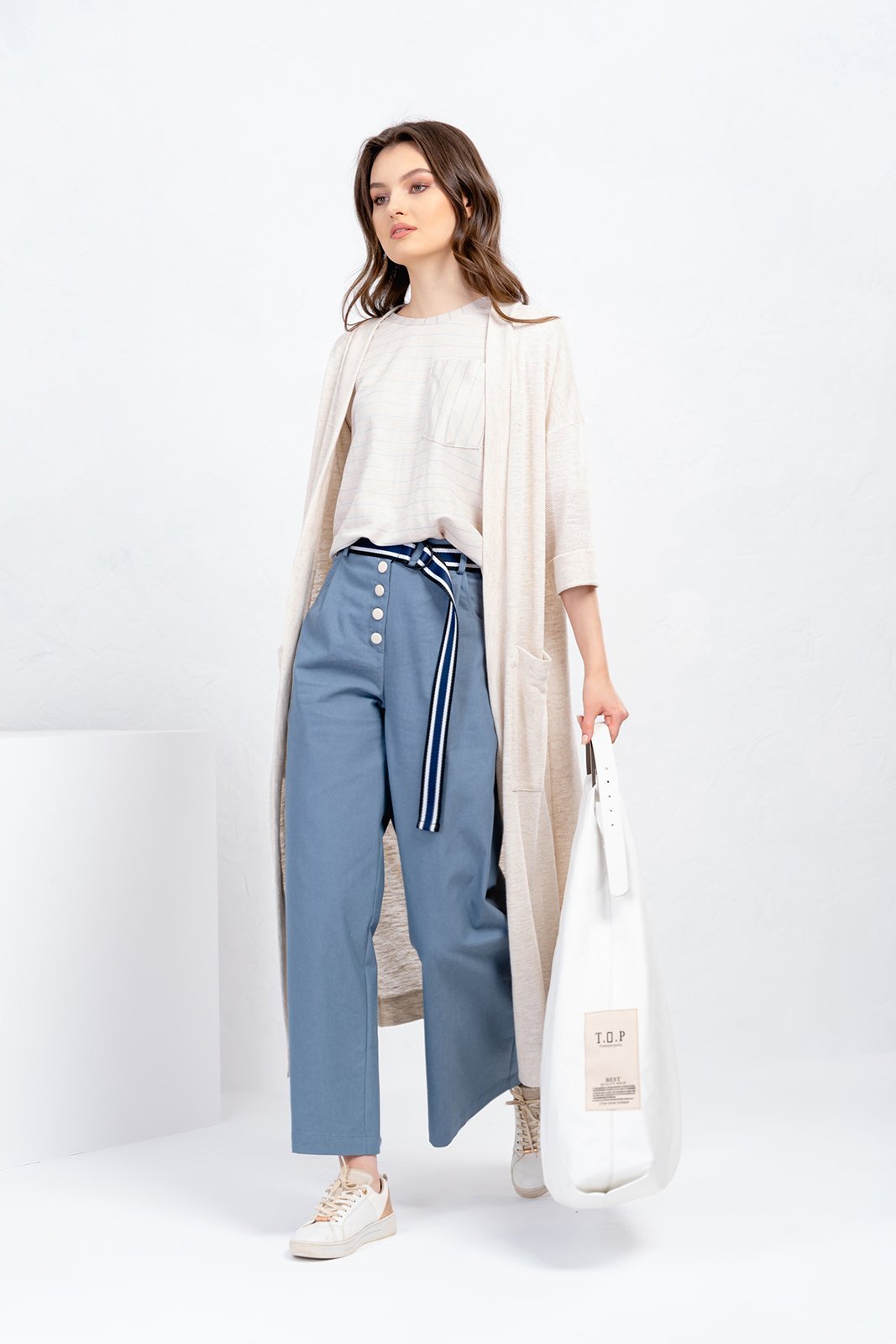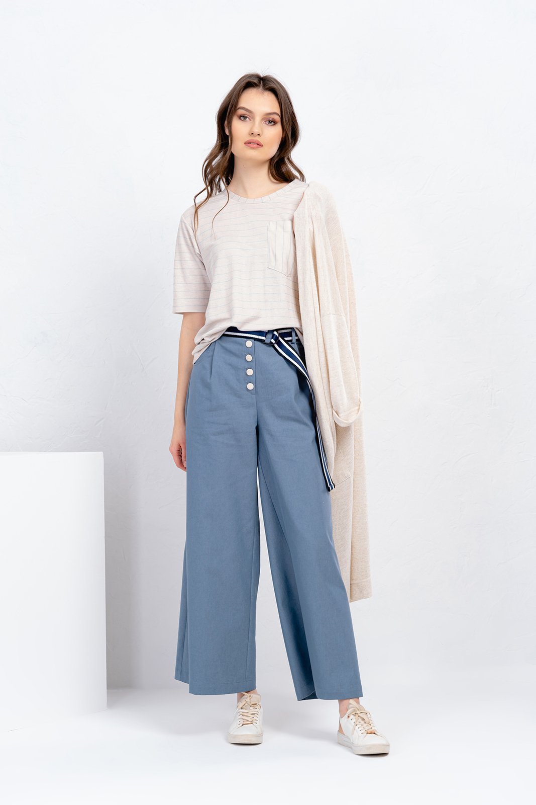 Комплект женский трехпредметный. Кардиган свободного покроя без застежки. Вырез горловины оформлен декоративной планкой. В боковых швах высокие разрезы. Рукав на базе цельнокроенного. На полочке накладные карманы. Длина спинки - 117 см. Длина рукава от горловины - 56см. Брюки- свободного покроя, прямые к низу. Пояс- отрезной на резинке со шлевками, карманы с отрезным бочком, застежка на петли и пуговицы. Длина брюк по боковому шву-101 см. Блуза -свободного покроя из мягкой трикотажной ткани с рукавом. Вырез горловины- неглубокий округлой формы. На полочке накладной карман Длина спинки- 60, длина рукава - 42 см. Комплект дополнен сьемным поясом на полукольцах.
