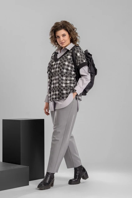 Комплект женский трехпредметный. Жилет свободного покроя из трикотажного полотна, с V-образным вырезом горловины. По боковым швам разрезы. Длина по спинке - 59 см. Рубашка классическая, полуприлегающая. Застежка на петли и пуговицы. Рукав втачной слегка спущеный, с планкой и манжетом по низу. Низ фигурный, по боковым швам - разрезы. Длина по спинке - 77 см, длина рукава от горловины - 77 см. По задней половинке и по переду декоративный клапан с пуговицей. Брюки классические слегка зауженные к низу, в боковых швах карманы с отрезным бочком. Застежка на молнию и петлю с пуговицей. Пояс отрезной с эластичной тесьмой. Длина с учетом пояса - 98 см. Блуза: Хлопок-98%, спандекс-2%;