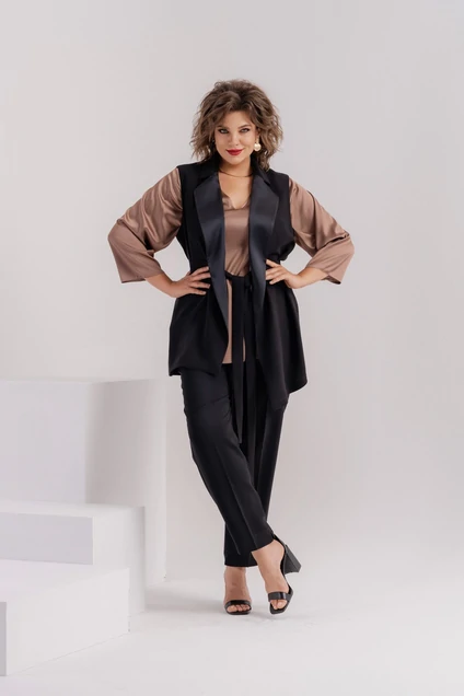 Жилет свободного покроя без застежки. Вырез горловины оформлен отложным воротником пиджачного типа, подборта из атласной ткани. Низ асимметричный. Изделие дополнено съемным поясом из основной ткани. Брюки - классические, зауженные к низу. В боковых швах карманы с отрезными бочками. Пояс - отрезной с эластичной тесьмой. Застежка на молнию и петлю с пуговицей. Блуза свободного покроя из атласной ткани. Вырез V-образной формы, неглубокий. Рукава реглан, в боковых швах разрезы. Блуза: ПЭ-100%