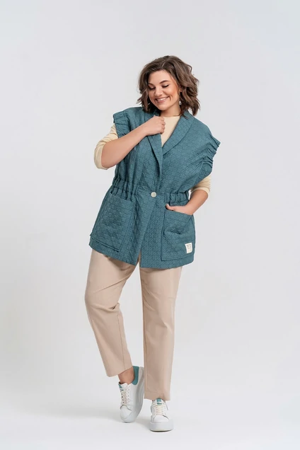 Комплект женский трехпредметный. Жилет из легкой стежки без подкладки. Вырез горловины оформлен шалевым воротником, застежка на петлю и пуговицу. По переду объемные накладные карманы. По линии талии кулиса с эластичной тесьмой. По проймам широкие планки с частичной вставкой эластичной тесьмы. Джемпер свободного покроя из трикотажного полотна. Вырез горловины неглубокий, округлой формы с отрезной планкой. Рукав втачной длинный. Брюки- бананы, зауженные к низу, с декоративными выточками по низу и колену. В боковых швах фигурные карманы. Пояс- отрезной с эластичной тесьмой. Застежка на молнию и петлю с пуговицей. Длина с учетом пояса см. Брюки: Хлопок-72%, ПЭ-26%, эластан-2%