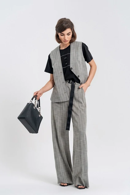 Комплект женский трехпредметный. Жилет на подкладке прилегающего силуэта с асимметричной застежкой на петли и пуговицы. Воротник пиджачного типа, рукав втачной, по низу с эластичной тесьмой. По переду карман в листочку. Длина по среднему шву спинки - 55 см. Блуза свободного покроя со спущенным рукавом. Вырез горловины- неглубокий округлой формы с отрезной планкой. Перед декарирован печатью. Длина спинки - 60 см. Длина рукава от горловины - 34 см. Брюки свободного силуэта, прямые от бедра. В боковых швах карманы с отрезным бочком. Застежка на молнию и петлю с пуговицей, пояс отрезной, по спинке с эластичной тесьмой. в боковом шве вставка из репсовой ленты, имитирующая отлетной пояс с фиксацией на полукольцах. Длина с учетом пояса - 110 см. Блуза: Хлопок-97%, спандекс - 3%
