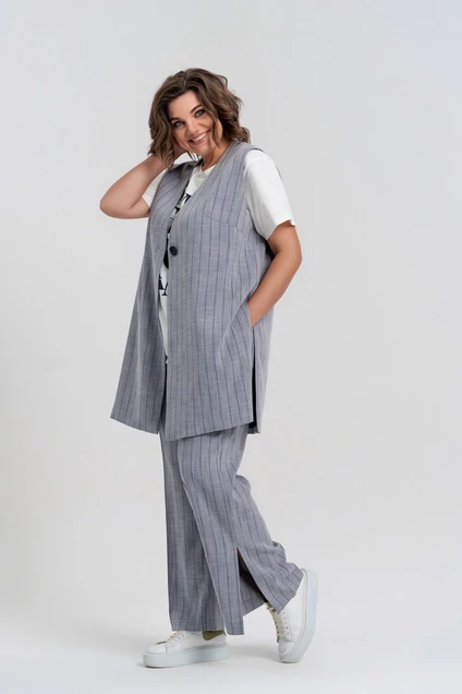 Комплект женский трехпредметный. Жилет на подкладке, с высокими разрезами в боковых швах. Без воротника, с застежкой на петлю и пуговицу. На спинке съемный хлястик. Длина изделия по спинке - 84 см. Брюки свободного силуэта, прямые. В боковых швах карманы с отрезным бочком, по низу разрез. Пояс отрезной со вставкой из эластичной тесьмы, застежка молния и петля с пуговицей. Длина с учетом пояса - 108 см. Блуза свободного покроя со спущенным рукавом. Вырез горловины- неглубокий округлой формы с отрезной планкой. Перед декарирован печатью. Длина спинки - 64 см. Длина рукава от горловины - 33 см. Блуза: Хлопок-97%, спандекс - 3%