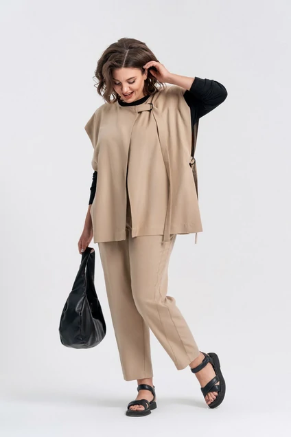 Комплект женский трехпредметный. Жилет-накидка прямого покроя, вырез горловины неглубокий округлой формы, застегивается на пату и полукольца. Боковые также скреплены между собой патой с полукольцами. Блуза свободного покроя с втачным рукавом. Вырез горловины- неглубокий округлой формы с отрезной планкой. Брюки свободного покроя, слегка зауженные к низу, с декоративными рельефами по переду в которых расположены функциональные карманы. Пояс отрезной с эластичной тесьмой. Застежка на молнию и петлю с пуговицей. Блуза: tencel-100%