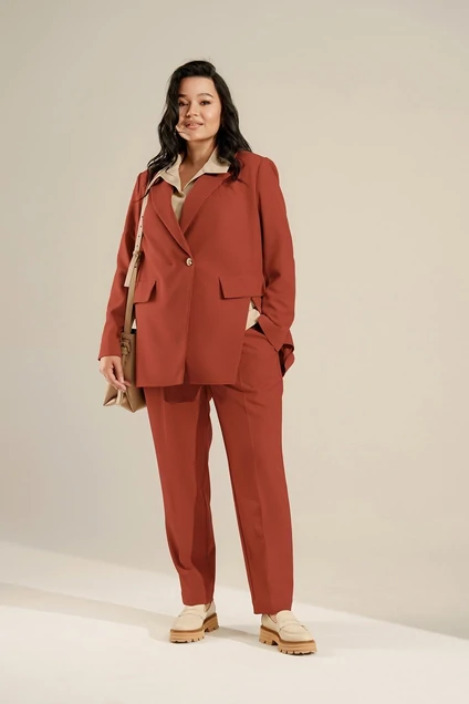 Комплект женский трехпредметный. Жакет прямой двубортный, частично на подкладке. Воротник пиджачного типа, по переду клапаны. Перед и рукава с фантазийной шлицей. Рукав втачной. Длина по среднему шву спинки - см, длина рукава - см. Брюки свободного покроя зауженные к низу. В боковых швах карманы с отрезным бочком. Застежка на молнию и петлю с пуговицей. Пояс отрезной с эластичной тесьмой. Длина с учетом пояса - см. Джемпер полуприлегающего силуэта из трикотажной ткани с воротником "поло" и длинным втачным рукавом. Длина по спинке - см, длина рукава - см. Блуза : Вискоза-65%, нейлон-30%, спандекс-5%