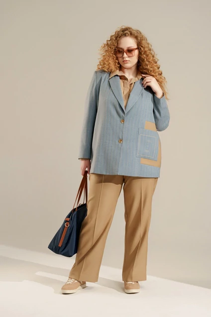 Комплект женский трехпредметный. Жакет на подкладке прямого силуэта. Воротник пиджачного типа, застежка на петли и пуговицы. Слева по переду вставка из контрастной ткани и накладной карман с декоративной печатью. Рукав втачной двушовный. На спинке шлица. Длина по среднему шву спинки - см, длина рукава - см. Блуза свободного покроя, с рубашечным воротником и потайной застежкой на петли и пуговицы. Рукав втачной с разрезом и манжетой с застежкой на пуговицы. Длина по спинке - см, длина рукава - см. Брюки прямые от бедра с карманами с отрезными бочками. Застежка на молнию и петлю с пуговицей. Пояс отрезной с вставкой эластичной тесьмы. Длина с учетом пояса - см. Блуза: Хлопок-55%, нейлон-40%, спандекс-5%; Брюки: ПЭ-90%, вискоза-10%