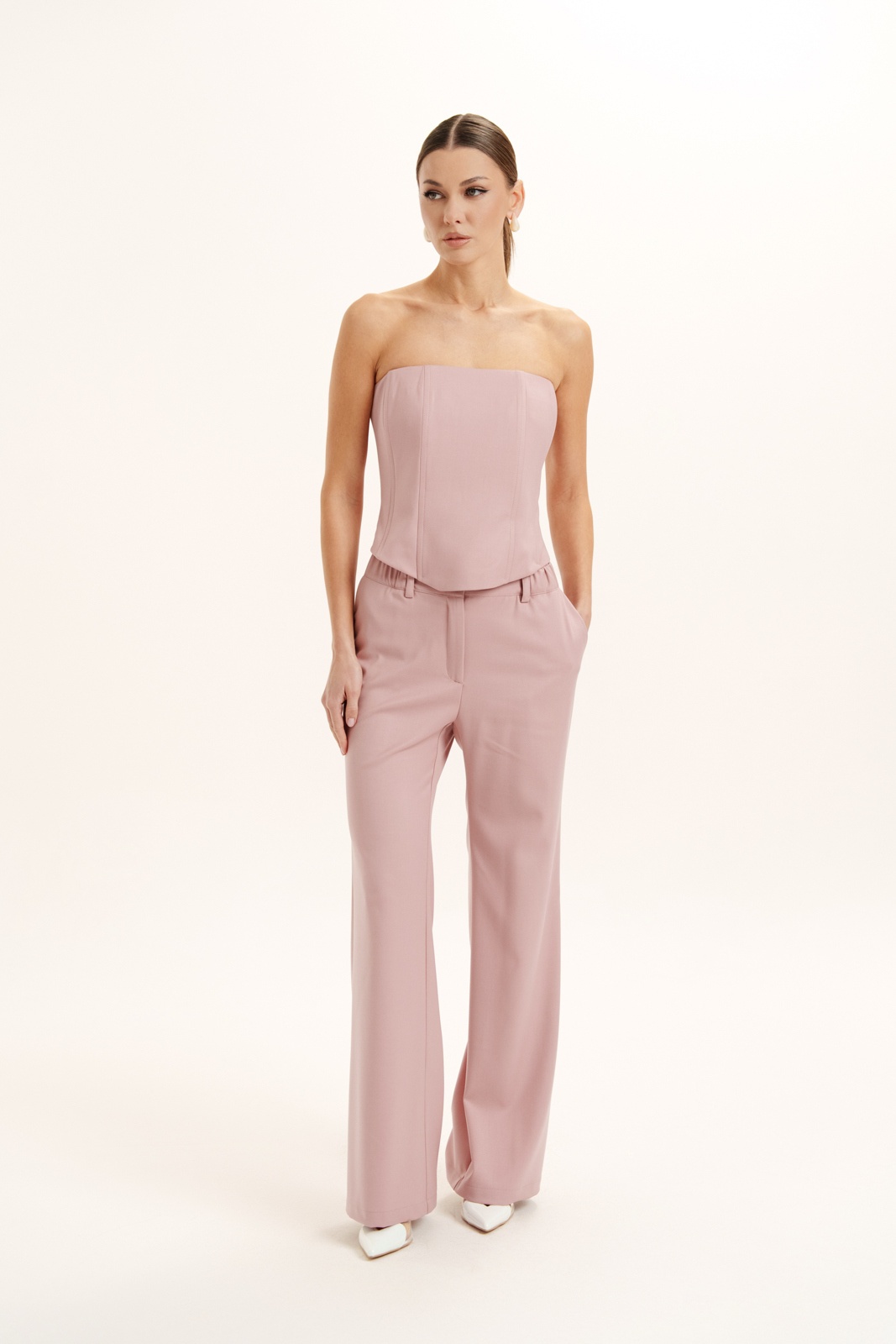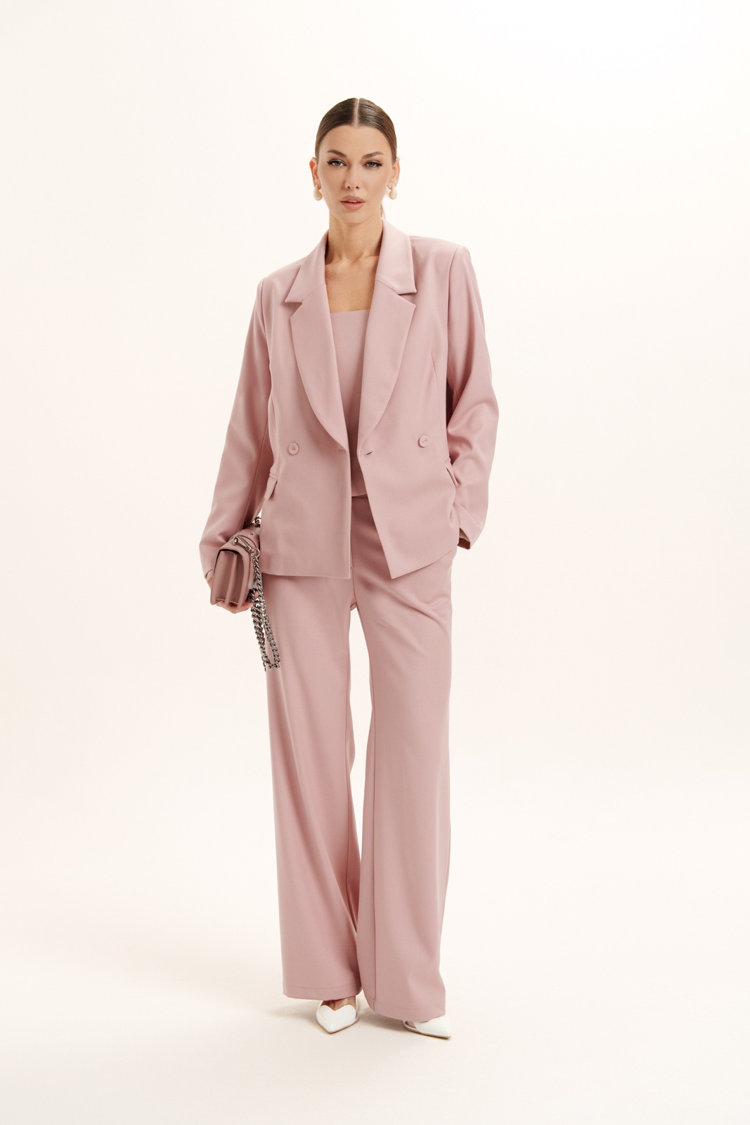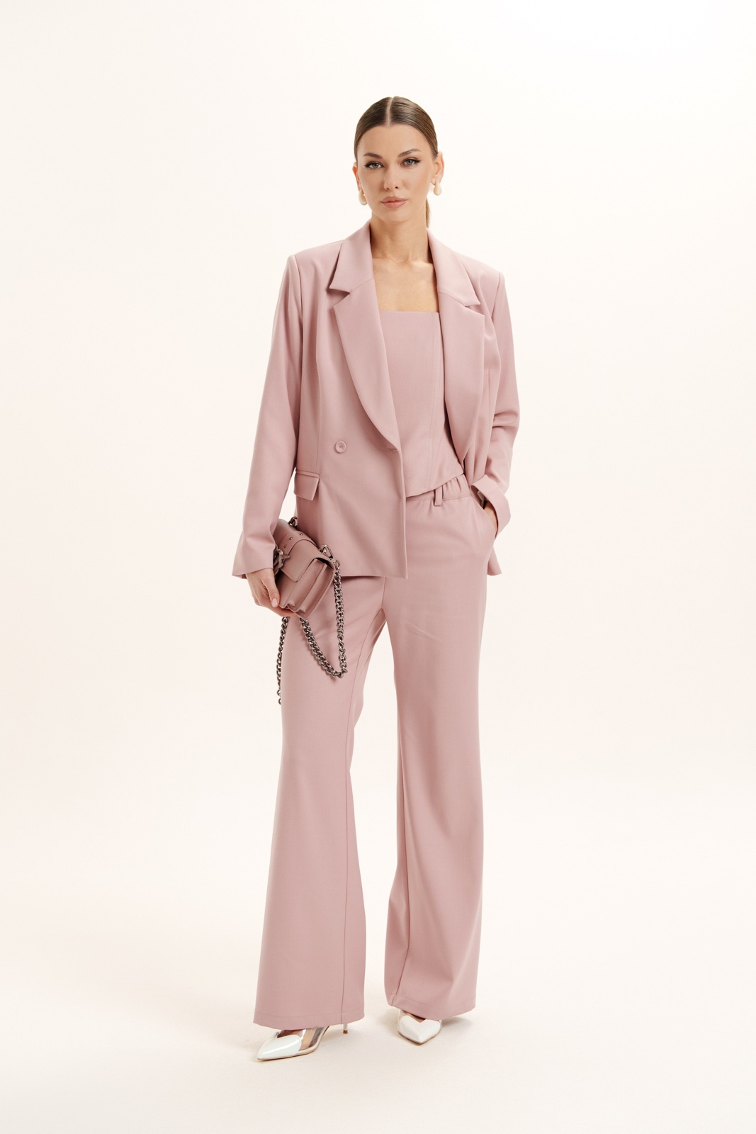 Костюм брючный 3160 Deesses — это выбор для современных женщин, стремящихся подчеркнуть свою индивидуальность. Коллекция бренда Deesses предлагает утончённое сочетание стиля и комфорта. Изготовленный из премиум костюмной ткани, он обеспечивает изысканный внешний вид и удобство в носке. Комплект включает жакет с прорезными карманами и корсет на молнии, который утягивает талию. Брюки с прямым силуэтом и эластичным поясом обеспечивают максимальную свободу движений. Этот наряд в мягком розовом цвете идеально подходит для делового или официального стиля. Весенне-летний сезон обретает новую глубину с этим костюмом, подчеркивающим уверенность и женственность в каждом шаге.