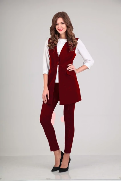 Комплект состоит из жилета и брюк (без блузы). Жилет полуприлегающего силуэта на одну пуговицу, выполнен на подкладке. От проймы до линии подреза -рельефы. В подрезе декоративный клапан. Брюки зауженные к низу.