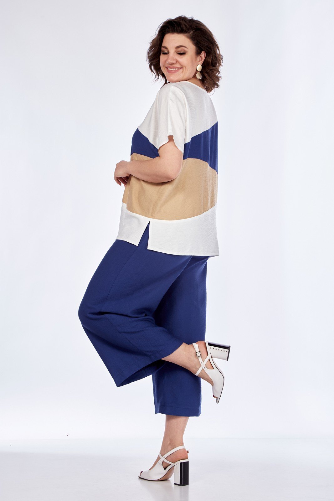 Элегантный женский брючный костюм включает блузу и кюлоты, предлагая современное сочетание уюта и стиля. Блуза выполнена из четырех цветов ткани: морской синий, песочный, кремовый и белый, создавая изысканный многоцветный дизайн с волнообразными подрезами на передней и задней части, что добавляет изящества силуэту. Цельнокройные рукава с спущенной линией плеча подчеркивают свободный крой модели. Кюлоты морского синего цвета дополняют ансамбль, обеспечивая комфортное ношение благодаря притачному поясу с эластичной вставкой сзади и практичной молнии спереди. Длина кюлот составляет 89 см, что идеально подходит для создания расслабленного, но при этом элегантного образа. Такой костюм отлично подойдет как для офиса, так и для вечерних мероприятий, оставаясь комфортным и модным выбором для любых ситуаций.