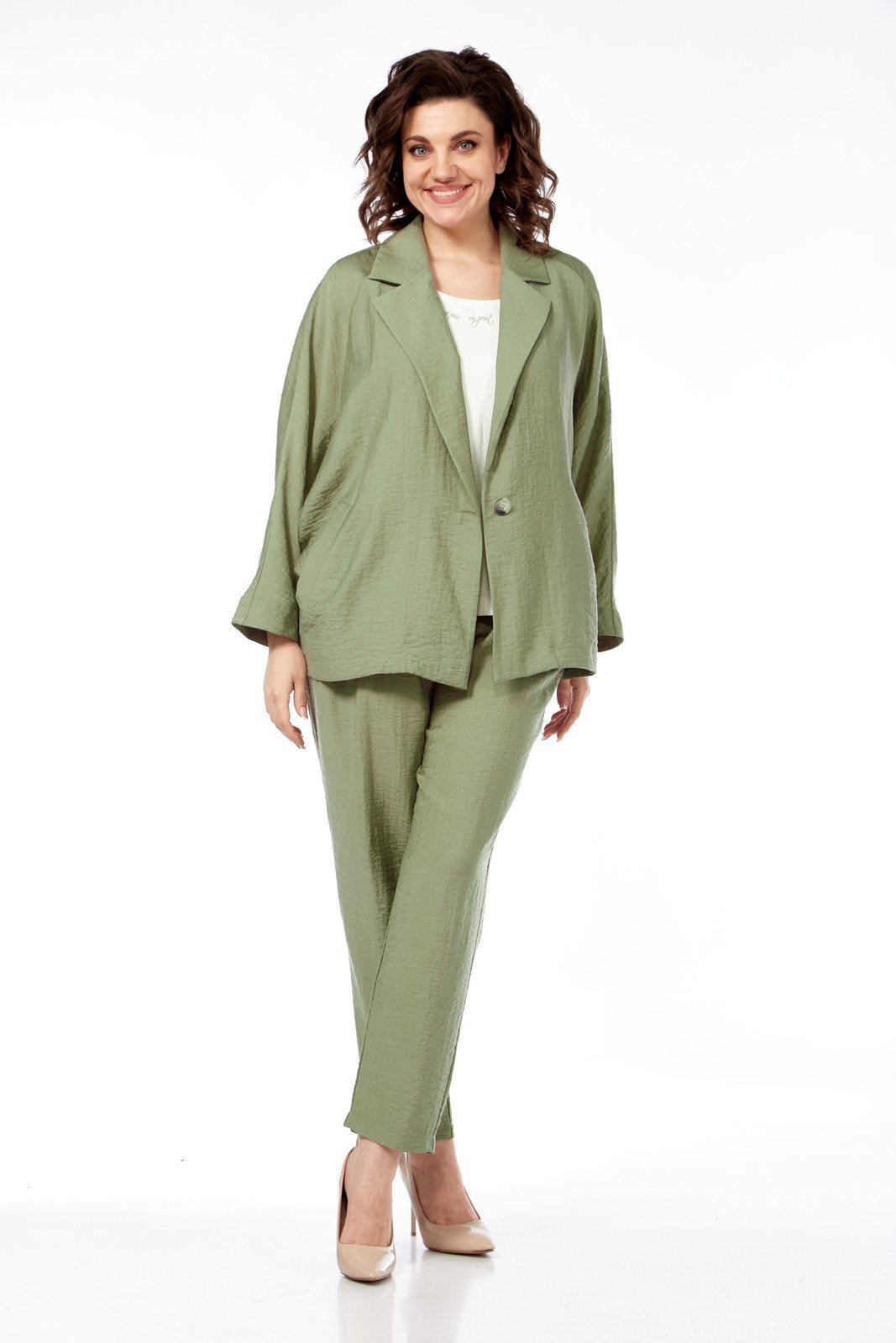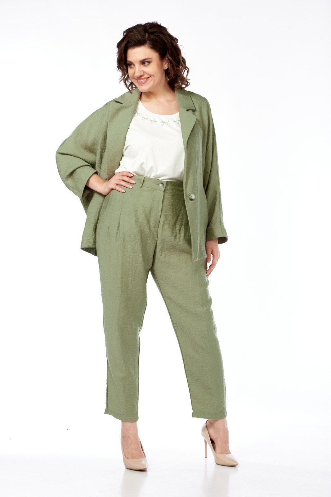 Комплект брючный состоит их жакета, трикотажной майки и брюк. Жакет свободного кроя с застежкой на петлю и пуговицу. Рукава-реглан. Воротник пиджачного типа с лацканами. Рукав боковой с "листочкой". Майка с цельнокройным рукаврм и округлой горловиной, украшена печатью. Брюки зауженные к низу с застежкой "молния" спереди. Задние половинки с талиевыми вытачками . Передние половинки брюк со складками и имитацией кармана. Пояс сзади на резинке. Длина жакета по спинке 67 см, длина рукава 60 см. Длина майки по спинке 60 см. Длина брюк 102 см
