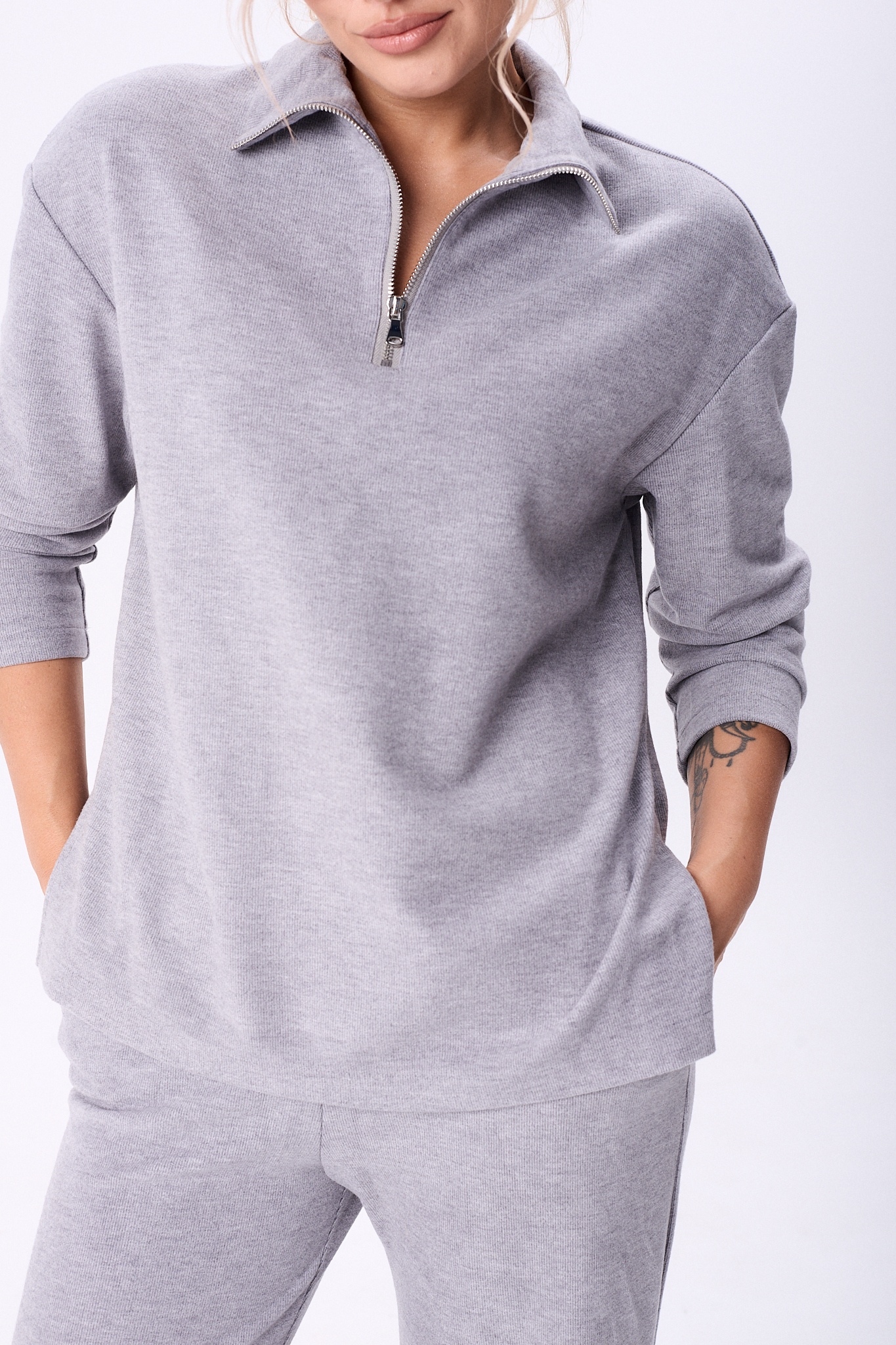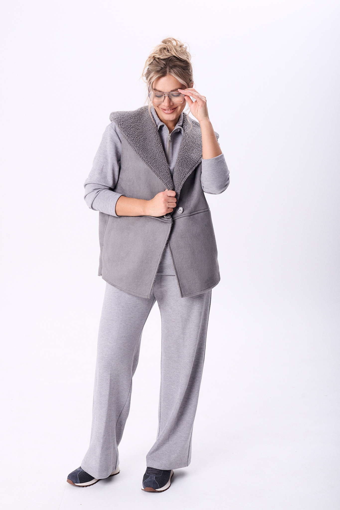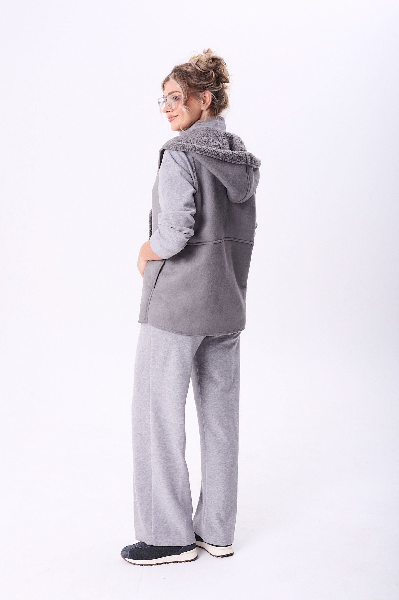 Комплект брючный состоит из кофты, жилетки и брюк. Кофта полуприлегающего силуэта со спущенным плечом, рукав втачной, одношовный. Воротник стойка с застежкой на тесьму-молнию. По боковым швам разрезы. Брюки расширенные книзу, верхний срез обработан поясом с резинкой. В боковых швах карманы. Жилетка свободного кроя со смещенной застежкой на петлю и пуговицу. По спинке горизонтальный рельефный шов на перед, в котором обработаны карманы. Цельнокроенный капюшон с центральной частью. В качестве отделки используется фурнитура. Длина кофты по спинке 66-72 см, длина рукава 54 см. Длина жилетки по спинке 72-80 см. Длина брюк 108-110 см