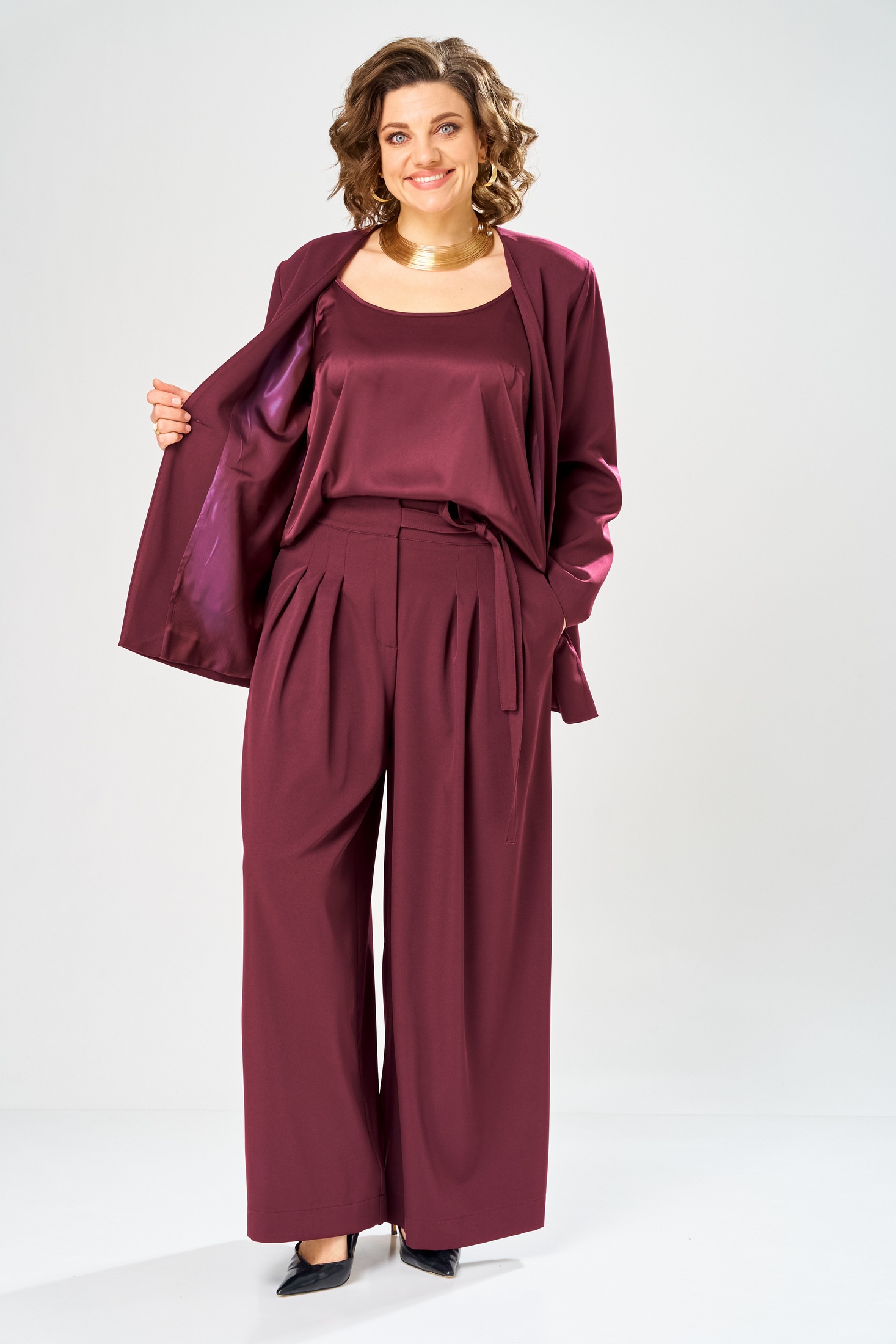 Костюм брючный 2149 бордо Diamant – это стильное решение для вашего гардероба. Коллекция бренда Diamant предлагает комплект из жакета, топа и брюк, выполненный из вискозы с добавлением полиэстера и эластана. Жакет прямого силуэта с застежкой на петлю и пуговицу дополнен боковыми карманами и V-образной горловиной. Топ из отделочной ткани с вытачками и регулируемыми бретельками идеально сочетается с широкими брюками с карманами и застежкой-молнией. Пояс по спинке на резинке, а на передней части дополнен завязками. Глубокий бордовый цвет костюма подчеркнет вашу индивидуальность, а его универсальный стиль подойдет как для деловых встреч, так и для повседневных прогулок в любое время года. Длина жакета по спинке составляет 71 см, длина топа – 47 см, а длина брюк – 110 см, что гарантирует комфорт и элегантность в каждом движении.