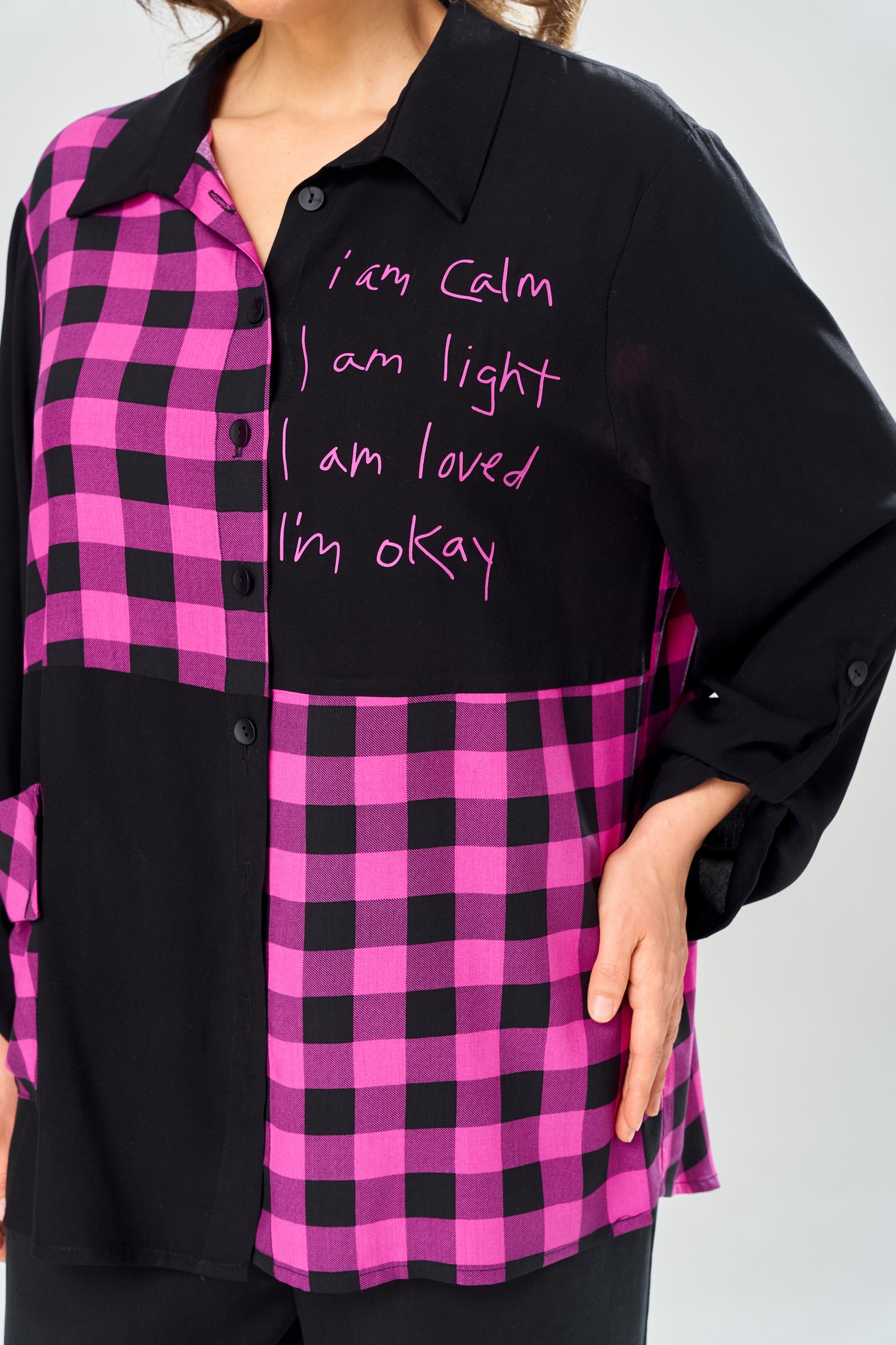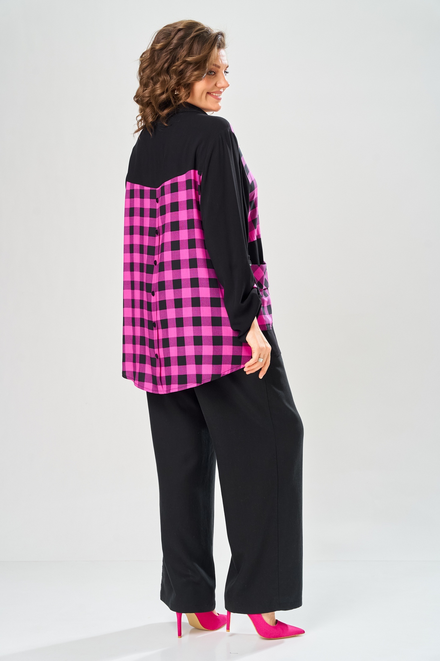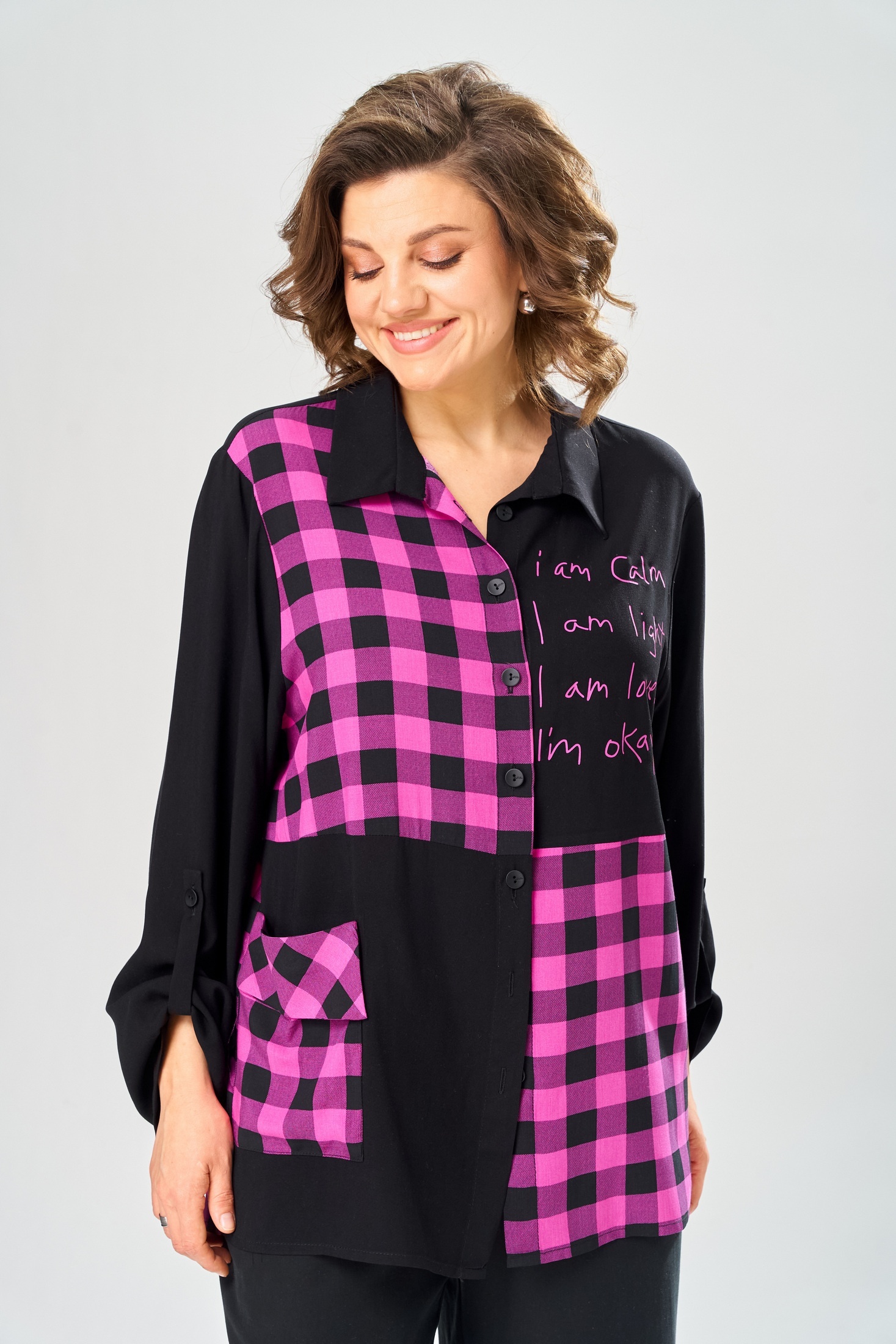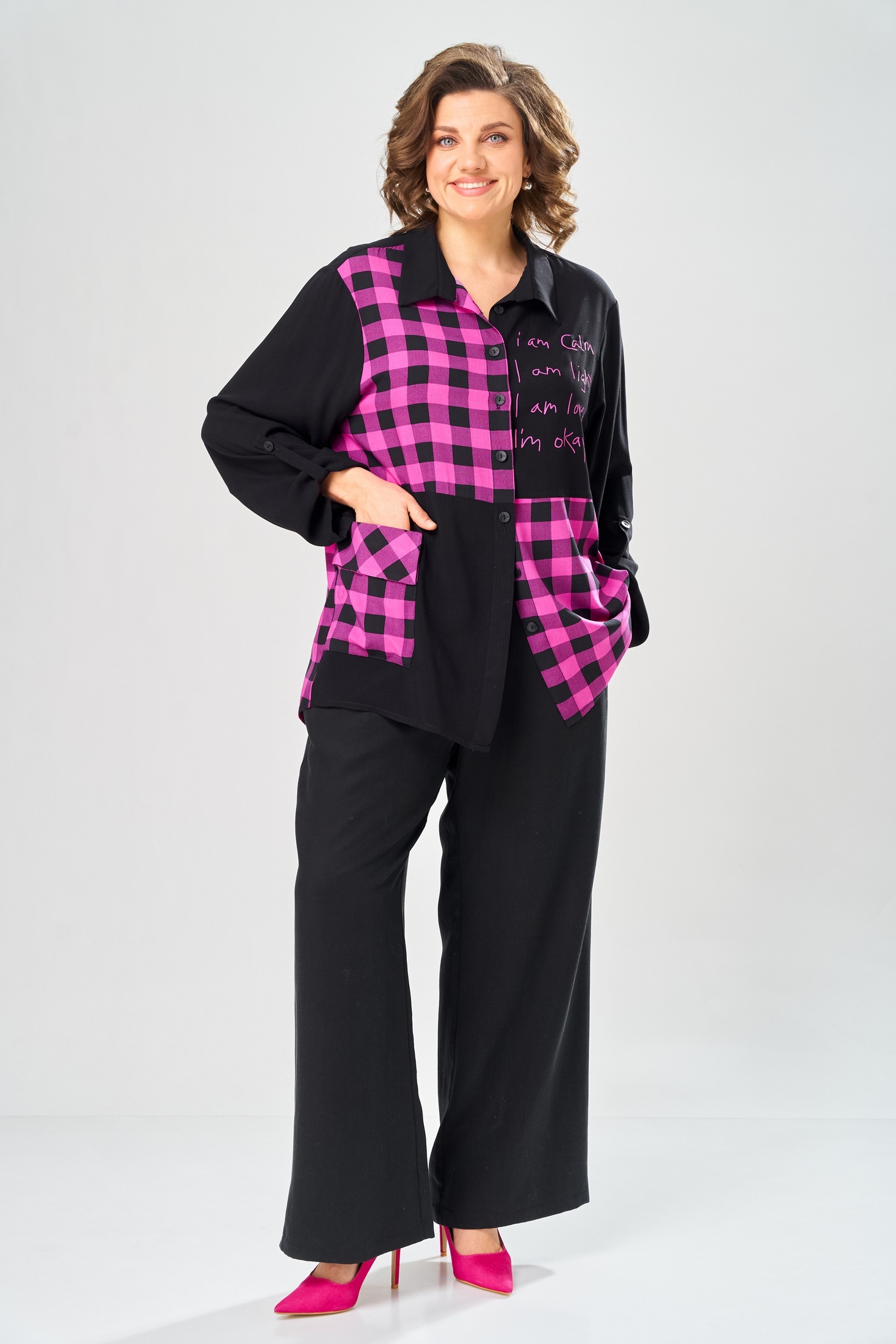 Костюм брючный 2151 черный Diamant — это стильный и удобный комплект для вашего гардероба. Коллекция бренда Diamant предлагает уникальное сочетание комфорта и моды. Блуза выполнена из высококачественной вискозы и хлопка, обеспечивая приятное носку и легкость. Вставки из ткани в клетку и черного цвета придают особую изюминку. Особенности фасона включают втачной одношовный рукав с хлястиком для регулировки длины, а также накладной карман на полочке. Прямые широкие брюки с резинкой на поясе и карманами создают идеальную посадку. Длина по спинке составляет 83 см, длина рукава — 63 см, а брюки имеют длину 106 см. Костюм предназначен для весенне-осеннего сезона и подходит для повседневного использования. Этот черный брючный комплект станет отличным выбором для современных женщин.