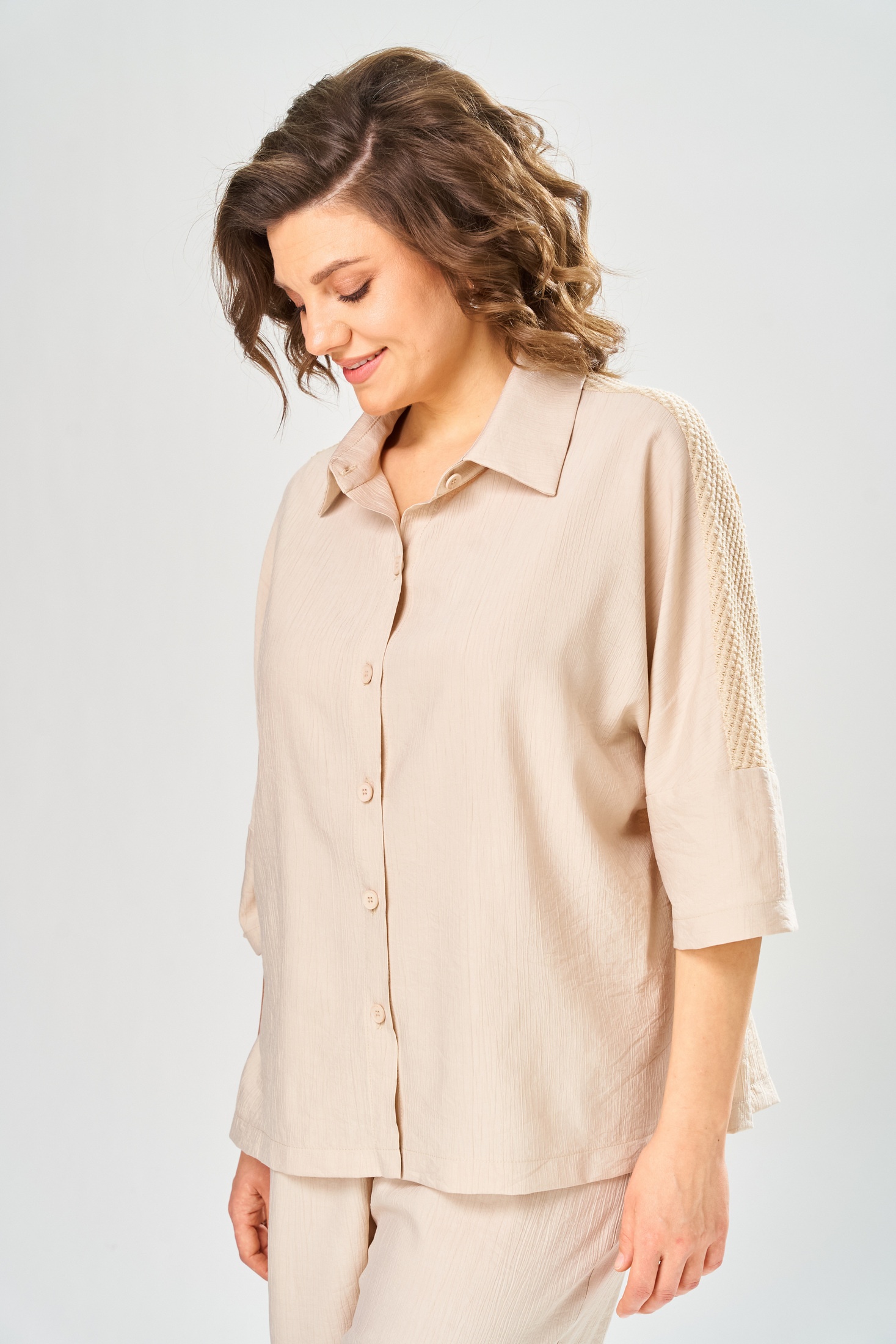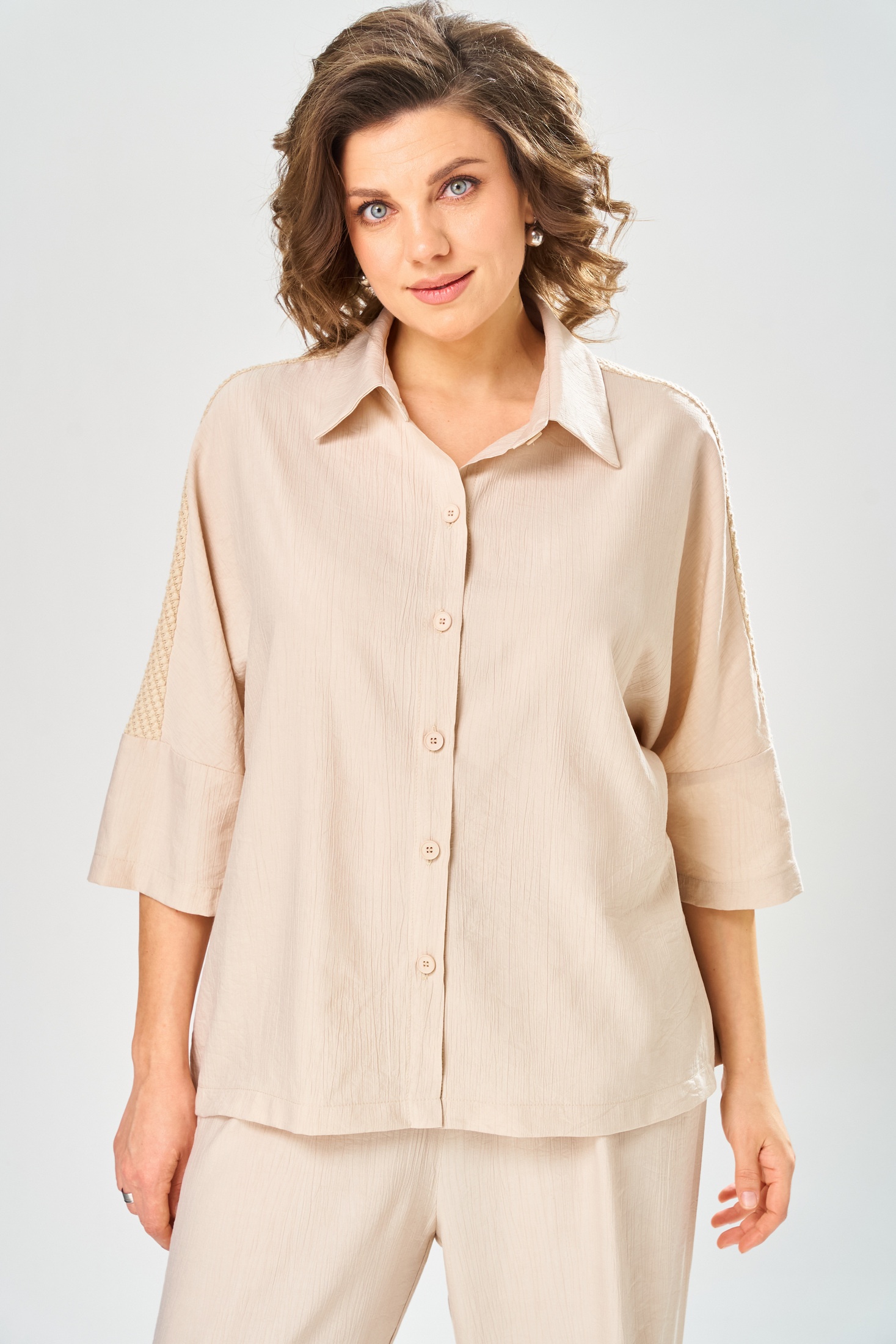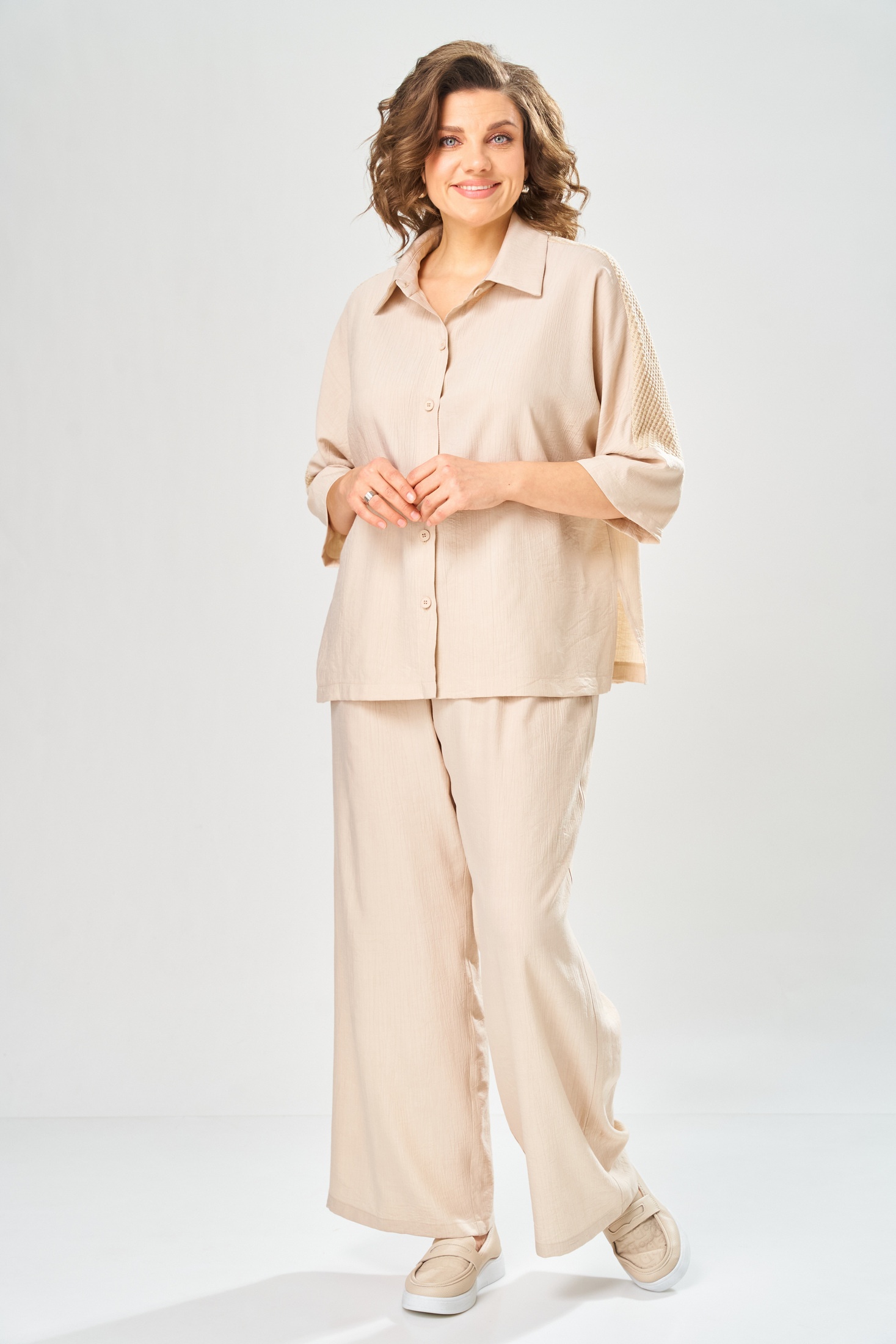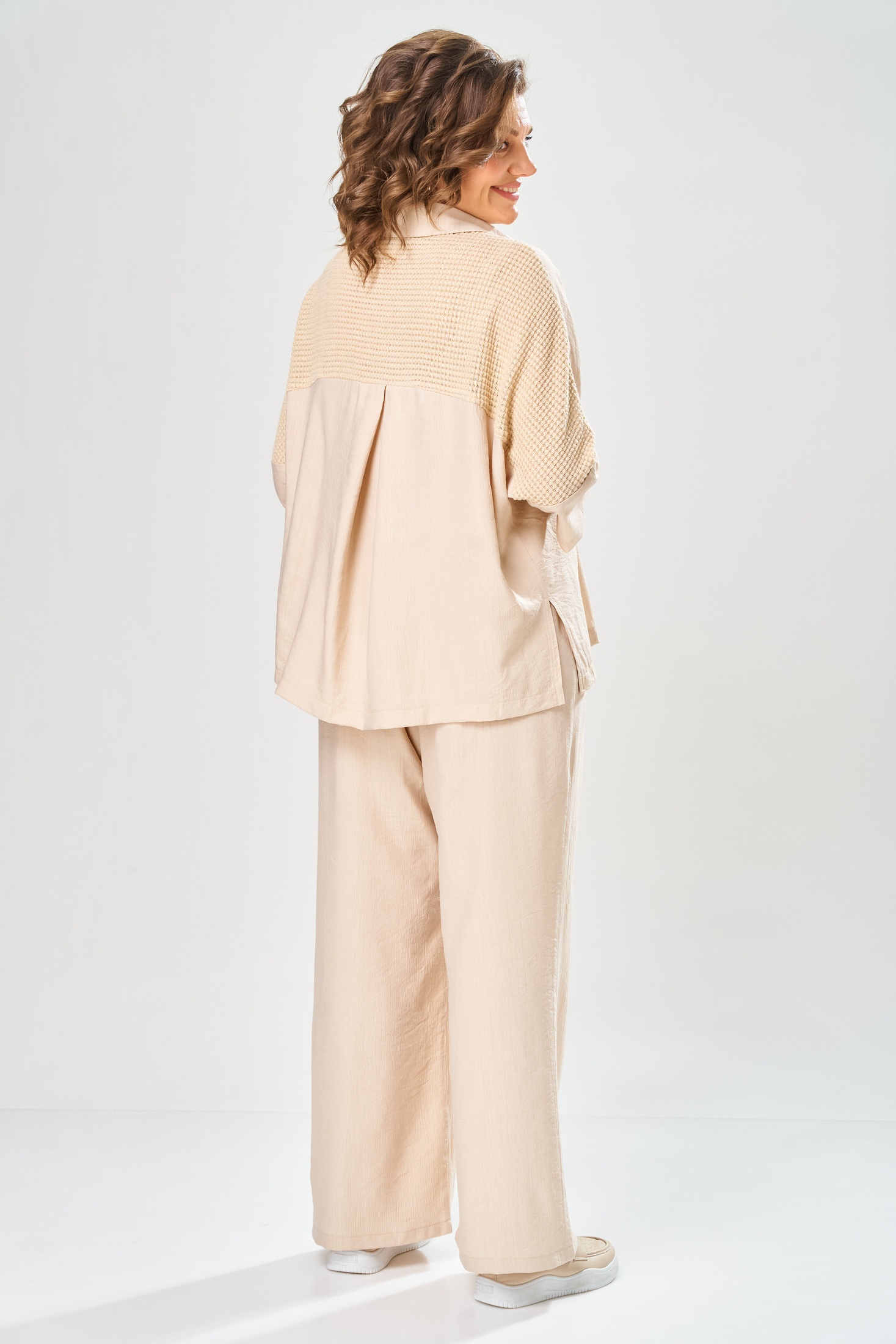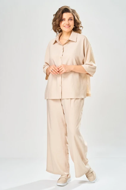 Костюм брючный 2159 крем Diamant — идеальное сочетание стиля и комфорта. Коллекция бренда Diamant предлагает изысканный комплект, состоящий из брюк и рубашки. Изготовлен из высокого качества полиэстера и вискозы, что обеспечивает долговечность и комфорт в носке. Брюки с прямым кроем и поясом на резинке обеспечивают удобную посадку. Рубашка с отложным воротником, коротким рукавом и спущенным плечом добавляет стильности. Застежка на пуговицы, разрезы по бокам и складка на спинке подчеркивают элегантность модели. Длина рубашки по спинке 74 см, что делает её подходящей для любого случая. Костюм выполнен в универсальном кремовом цвете, идеально подходящем для теплого времени года и повседневного использования.