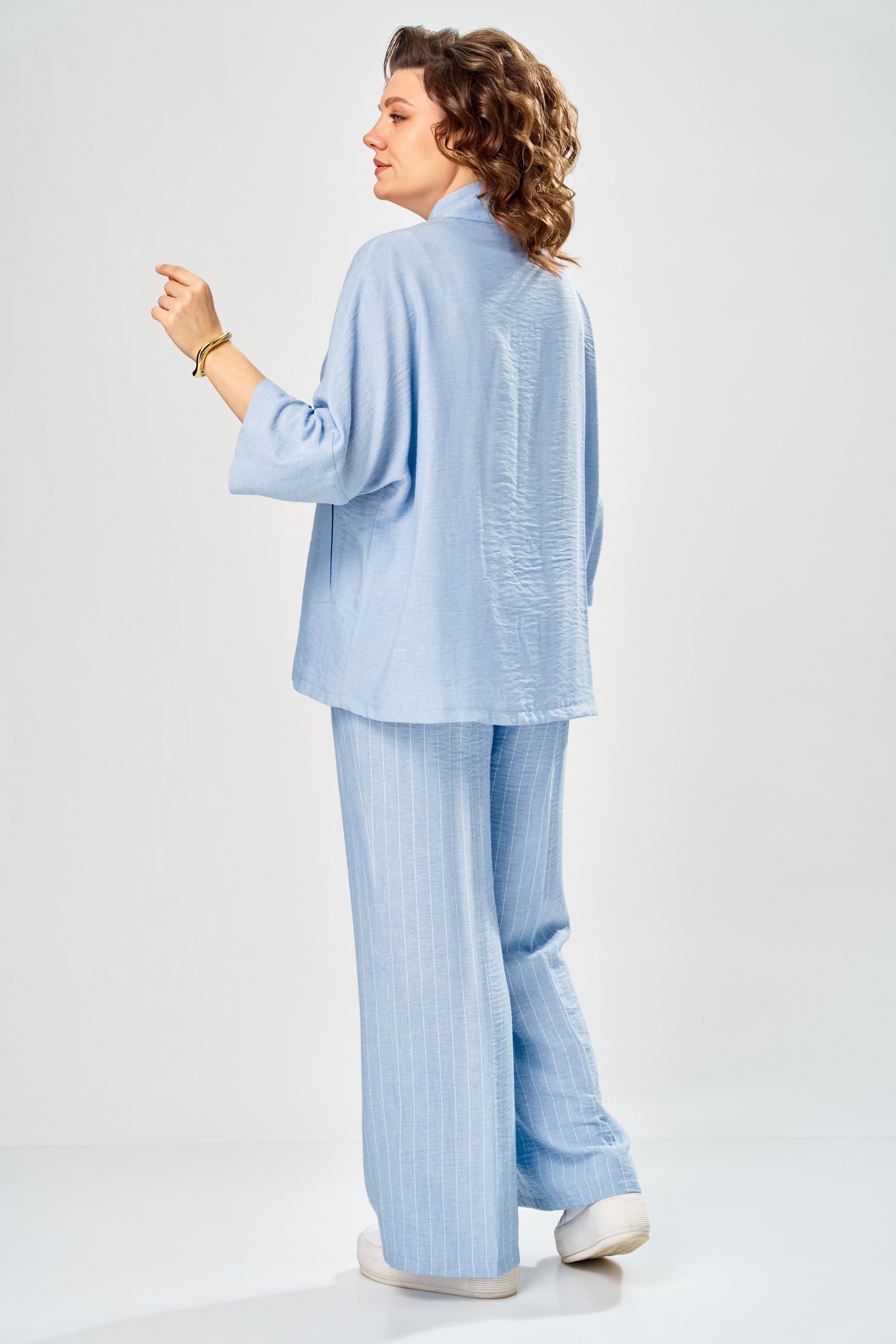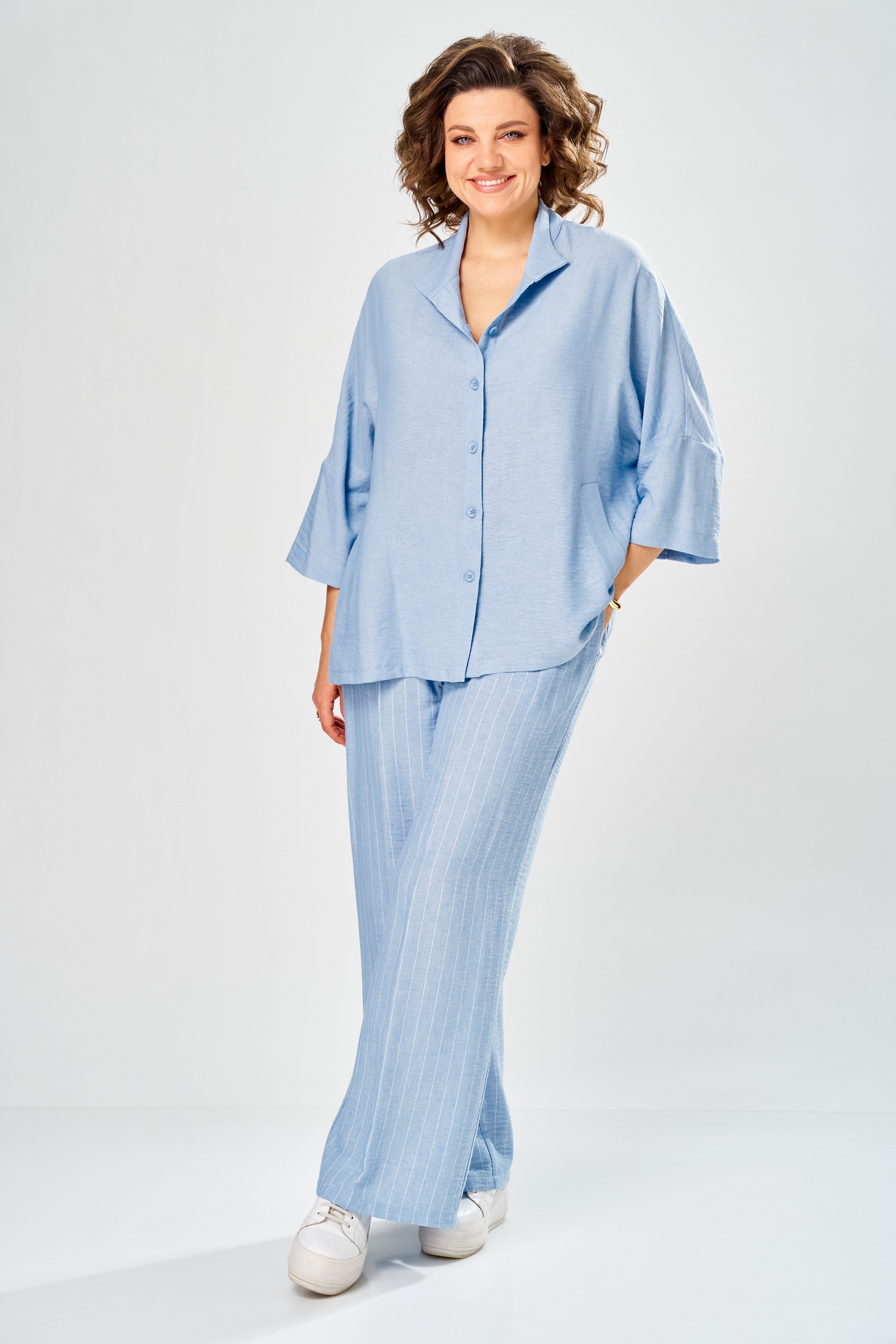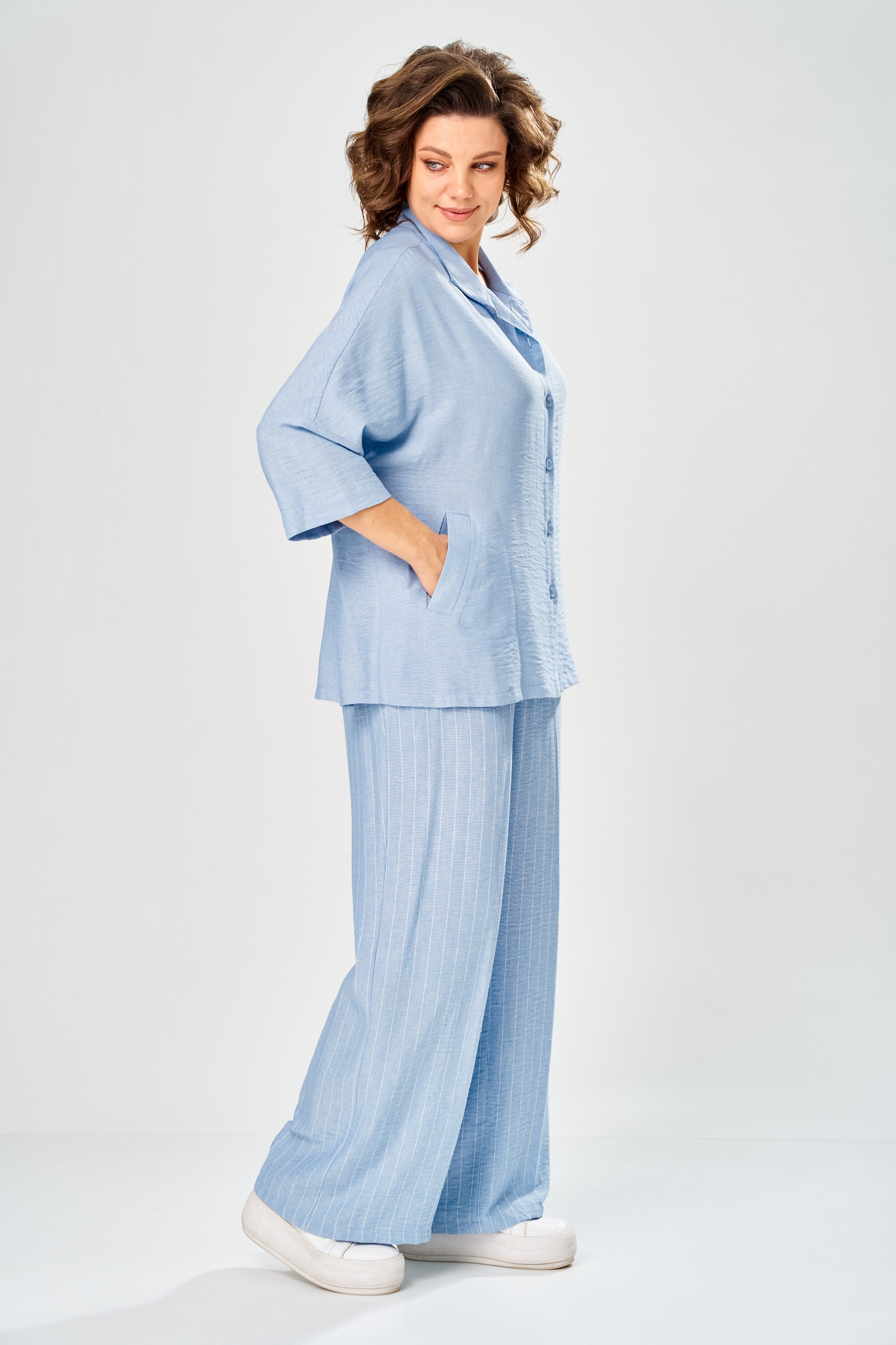 Костюм брючный 2162 голубой Diamant - это стильный и удобный выбор для повседневной носки. Коллекция бренда Diamant предлагает комплект из качественных материалов: лен и вискоза обеспечивают легкость и комфорт. Свободного кроя рубашка с воротником стойкой и карманами подходит для теплой погоды. Брюки с широкими штанинами и боковыми карманами добавляют практичности. Голубой цвет и вертикальные полоски делают костюм элегантным и современным. Длина по спинке рубашки 70-74 см, а длина брюк 108 см, что идеально подходит для создания свежего летнего образа.
