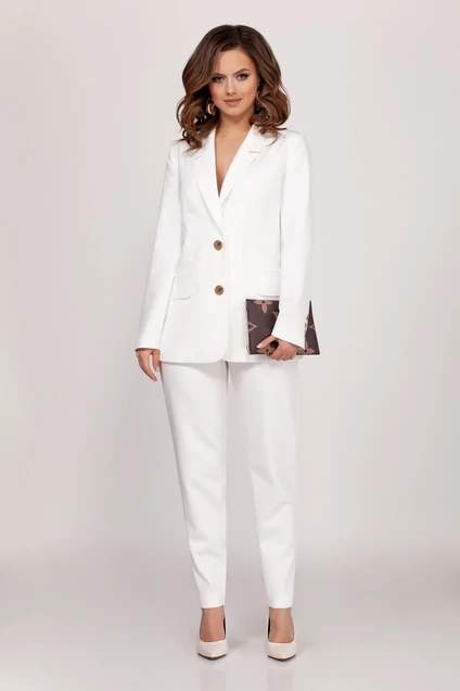 Жакет женский полуприлегающего силуэта, длиной ниже линии бедер. Спинка с вертикальными рельефами. Перед с центрально – бортовой застежкой на 2 петли пуговицы и воротником пиджачного типа, вертикальными рельефами доходящими до линии кармана в рамку с клапаном. Рукава втачные, двухшовные, по низу рукава обработана шлица обманка на 4 пуговицы. Жакет на подкладке.