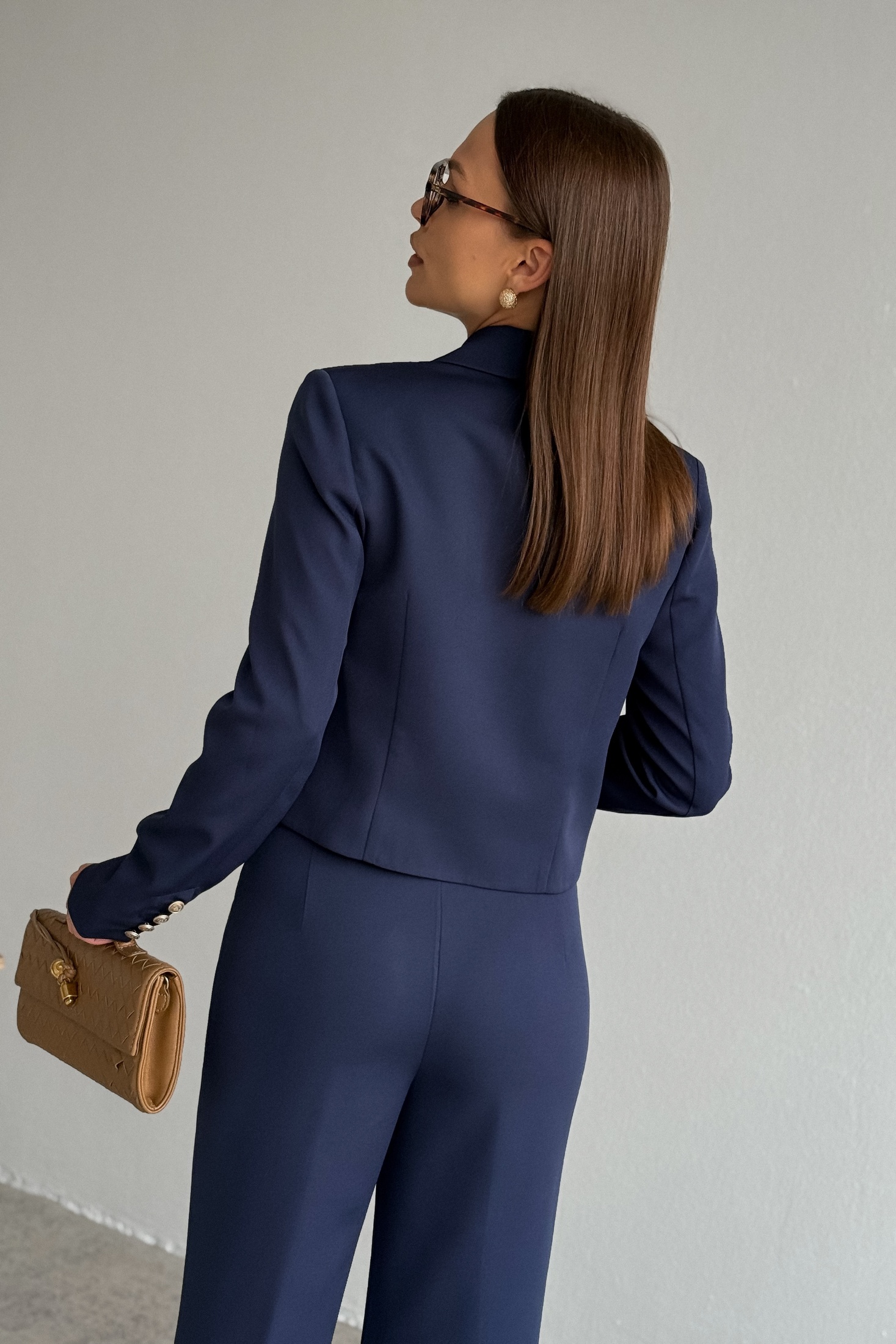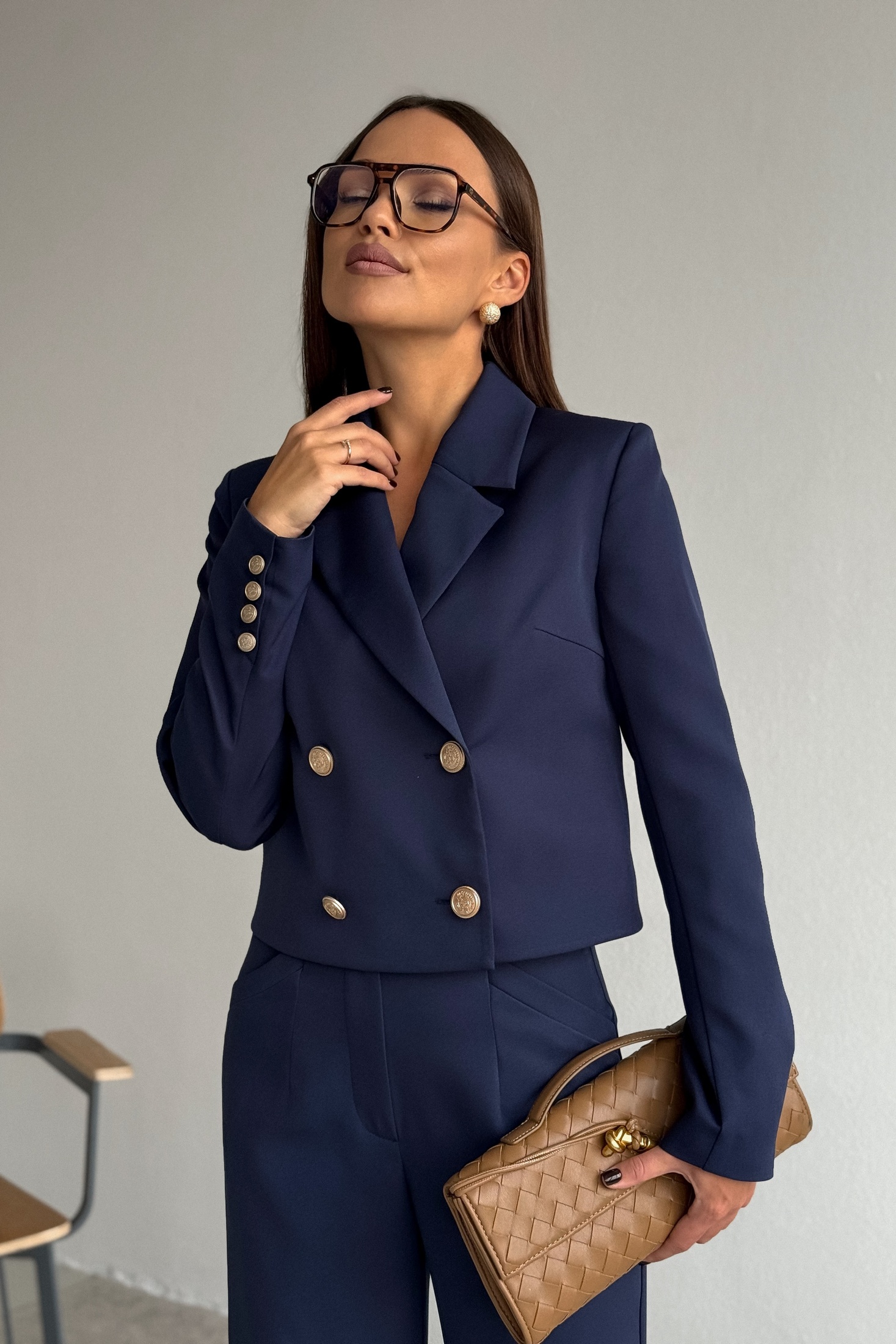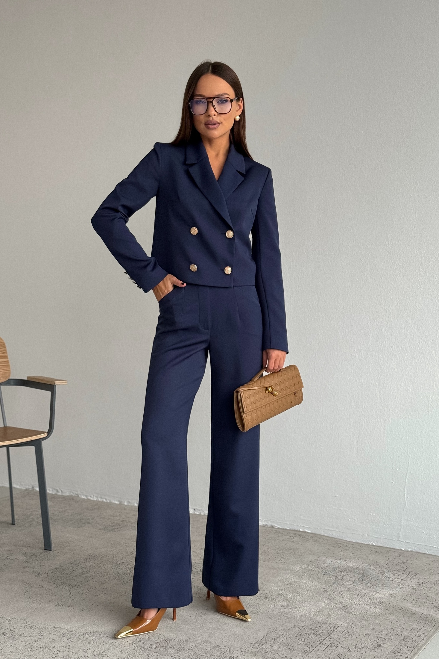 Костюм брючный 2122 синий DilanaVIP — это изысканный двух-предметный комплект, состоящий из жакета и брюк, который добавит стильности вашему гардеробу. Коллекция бренда DilanaVIP предлагает современному покупателю комбинацию вискозы, полиэстера и спандекса, что обеспечивает комфорт и легкость в носке. Брюки-палаццо с высокой талией и боковыми карманами создают эффектный силуэт и удобство. Укороченный жакет полуприлегающего силуэта с двубортной застежкой на пуговицы и классическим воротником дополняет образ. Темно-синий цвет делает костюм универсальным и подходящим для офисных встреч, деловых переговоров и вечерних мероприятий. Этот комплект — идеальный выбор для сезона весна-лето, он подчеркивает современный стиль и функциональность.