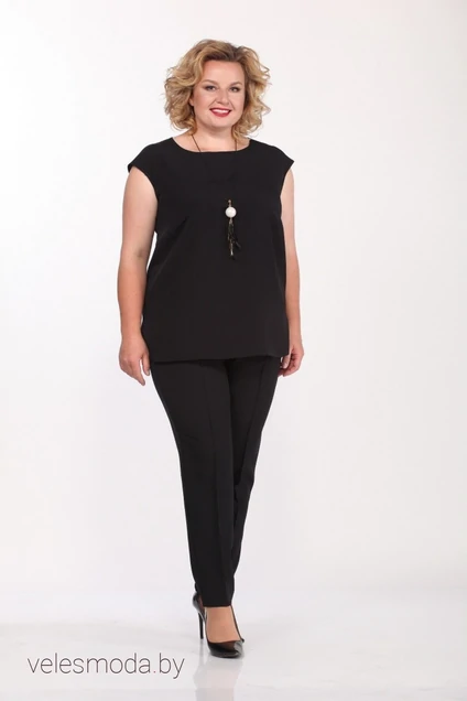 Топ полуприлегающего силуэта. Горловина круглая. В верхней части спинки вырез капелька и застежка на 1 навесную петлю и пуговицу. По бокам снизу разрезы закругленной формы.