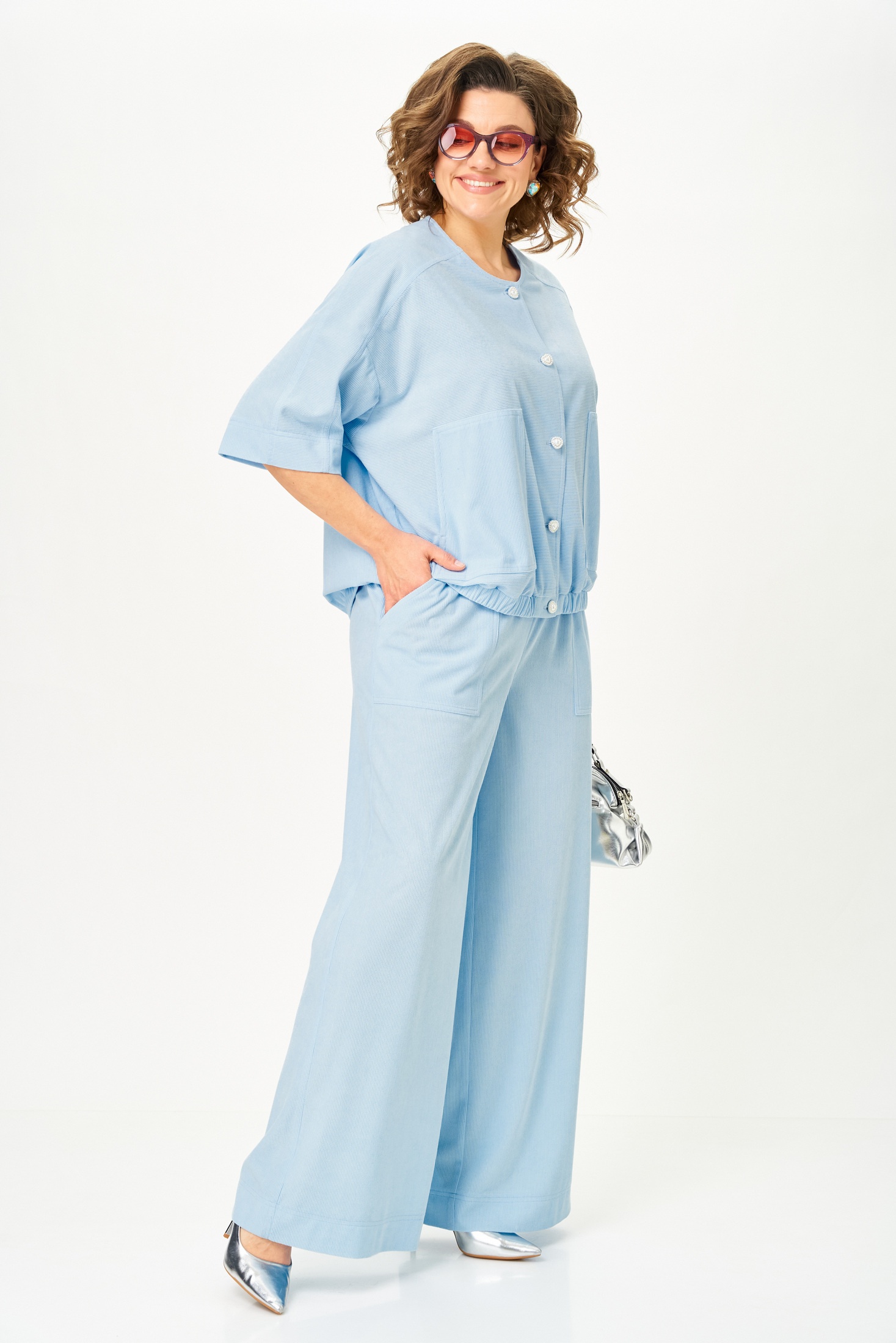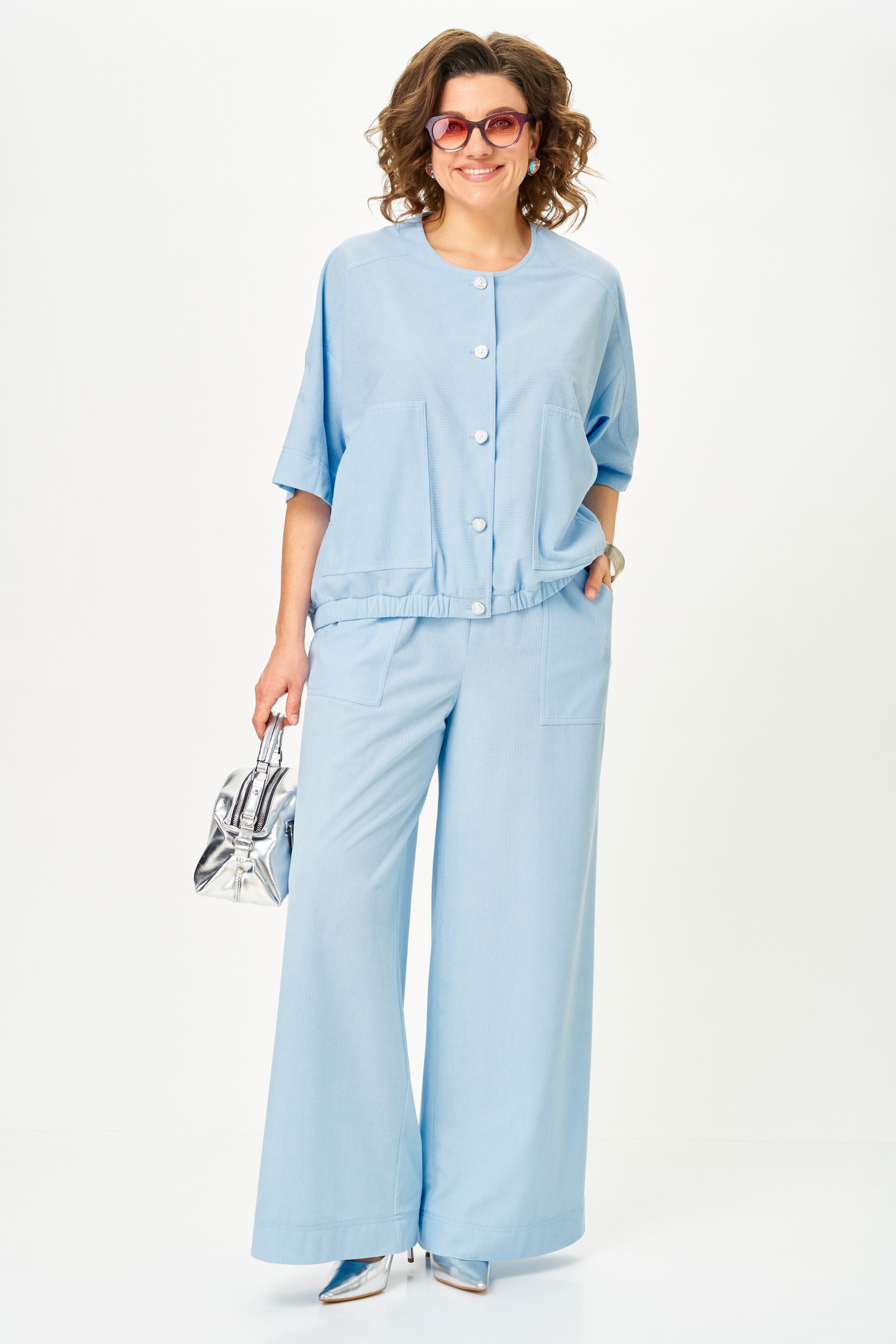 Костюм брючный 26238 голубой DOGGI завоевывает внимание своим легким и воздушным дизайном. Летний брючный костюм из коллекции бренда DOGGI выполнен из вельвета с добавлением вискозы и спандекса, что обеспечивает комфорт в жаркий день. Жакет свободного кроя с укороченными резными рукавами дополнен накладными карманами и застежкой на пуговицы. По низу жакета проходит эластичная лента, что добавляет практичности. Прямые брюки средней посадки на поясе с резинкой завершены накладными карманами. Их свободный силуэт идеально вписывается в повседневный и праздничный стиль. Голубой цвет подчеркивает свежесть и легкость образа, делая его идеальным для весенне-летнего сезона.